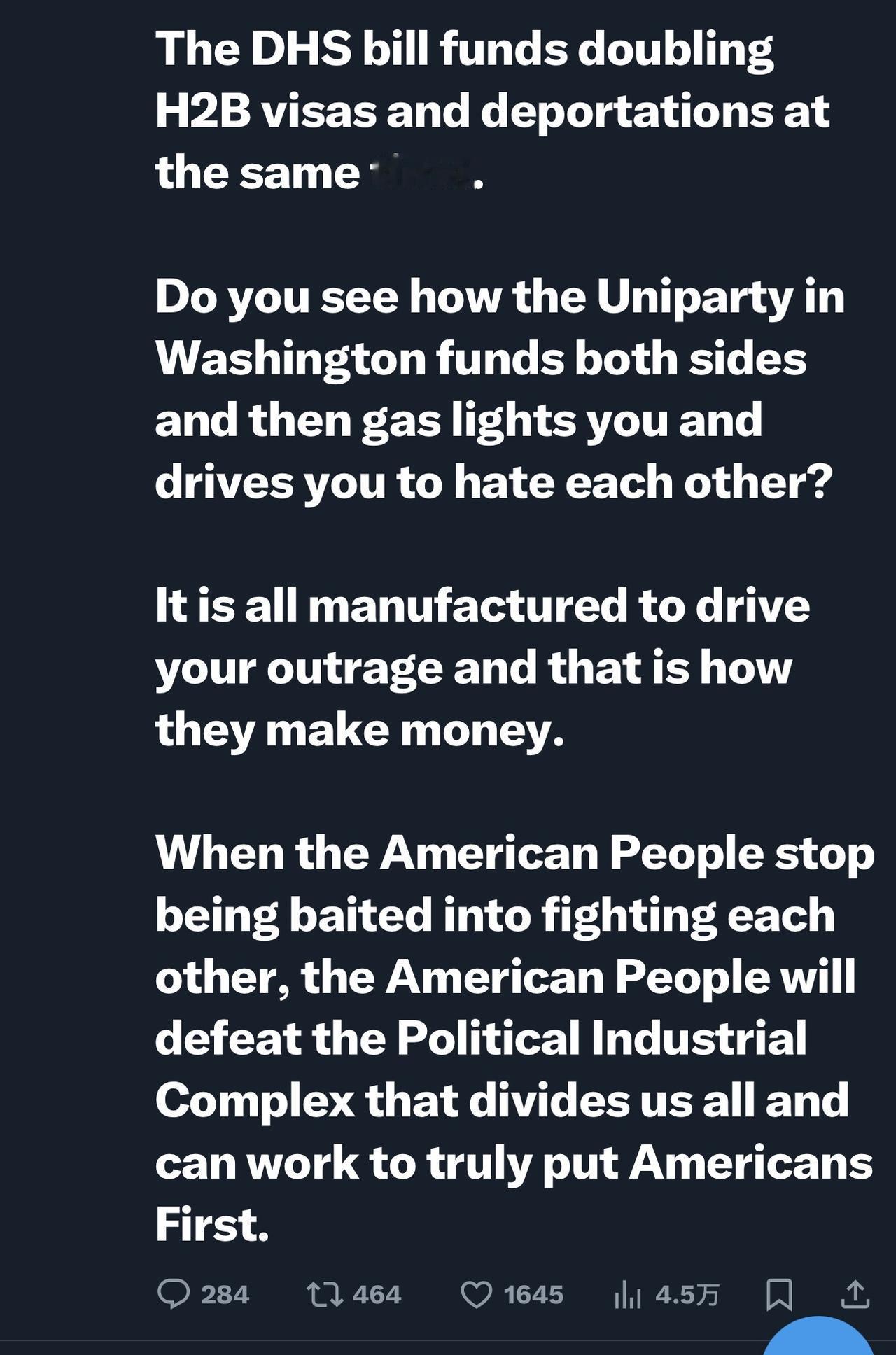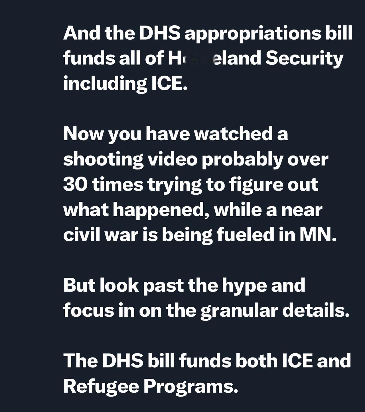 美国前乔治亚州国会众议员玛乔丽.泰勒.格林: “当政治产业复合体通过社交媒体和新闻媒体对你进行精神操控,告诉你应该对什么感到愤怒时,请思考一下这个问题。 尽管你一直在为支付难民资金而焦头烂额,同时又发现了索马里的所有欺诈行为,但共和党人还是在国土安全部拨款法案中用你纳税人的近 60 亿美元资助了难民计划。 国土安全部拨款法案为包括移民和海关执法局(ICE)在内的所有国土安全部门提供资金。 现在你可能已经反复观看了30多遍枪击视频,试图弄清楚发生了什么,与此同时,明尼苏达州正酝酿着一场近乎内战的局势。 但要透过炒作看本质,关注细节。 国土安全部法案同时为移民和海关执法局(ICE)和难民项目提供资金。 国土安全部法案拨款将 H2B 签证数量翻倍,同时还将遣返人数增加一倍。 你们看清华盛顿的两党是如何资助两党,然后对你们进行精神操控,让你们互相仇恨的吗? 这一切都是人为制造的,目的是为了激起你的愤怒,他们就是这样赚钱的。 当美国人民不再被诱导互相争斗时,美国人民就能战胜分裂我们所有人的政治工业复合体,并真正做到以美国人民的利益为先。”