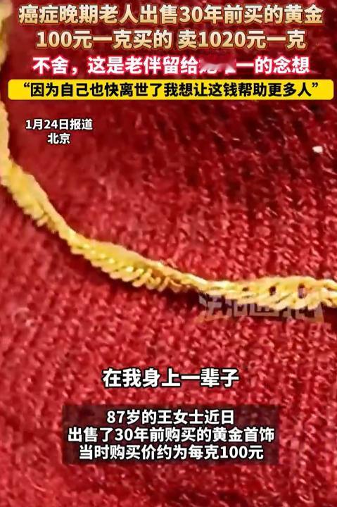 泪目!北京,一名87岁老奶奶癌症晚期,觉得自己状态不好,再加上近期金价高,就把30年前买的黄金拿出来准备卖掉,当初100元一克买的黄金,如今翻了整整10倍多,她表示虽然不舍,但想用这笔钱帮助到更多的人。 这位老奶奶年纪大了,还得了癌症,已经是晚期,这段时间她明显感觉到自己的状态越来越不好,身子也一天比一天弱。 老奶奶手里有一点黄金,是三十年前买的,那时候条件不算好,这批黄金是她老伴省吃俭用给她买的,也是老伴离世后,留给她唯一的念想。 这么多年来,老奶奶一直特别珍惜,舍不得戴,平时都小心翼翼地收在一个旧的红木首饰盒里,里面还用丝绒布袋层层裹着,只有想念老伴的时候,才会拿出来轻轻摸一摸。 这段时间,老奶奶听说现在金价涨得很高,比她当初买的时候贵了很多,心里就有了一个念头。 她觉得自己剩下的日子不多了,留着这些黄金也没什么用处,不如卖掉,用换来的钱帮一帮那些需要帮助的人。 做出这个决定后,心里其实特别不舍,那天,在女儿的陪同下,她拿着黄金去了金店,把黄金递交给工作人员之前,还忍不住凑过去轻轻亲了亲那枚刻着细小纹路的金戒指,手指微微颤抖着,眼里满是不舍,却又透着一股坚定。 周围有人劝她,让她把钱留着给自己治病,或者留给家里的子女,可老奶奶摇了摇头,她说自己的病自己心里清楚,不如把钱用在有用的地方,帮助更多人,也算是完成了老伴生前的心愿。 这位老奶奶,自己正承受着癌症的折磨,却还想着体谅别人、帮助别人,她卖掉的不仅仅是一些黄金,更是自己珍藏了三十年的念想,换来的却是给陌生人的希望。 没有华丽的话语,没有惊天动地的举动,可这份平凡里的善良,却让很多人看了都忍不住泪目,也让我们看到了人间最温暖的模样。 以上都是个人观点,对此您有什么不同的看法,可以在评论区留言讨论!!!