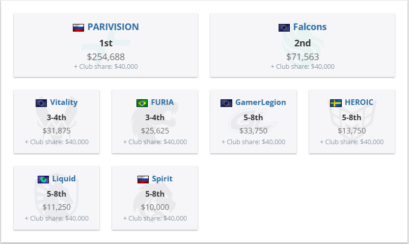 冠军PARIVISION:选手奖金254,588美元、俱乐部奖金4万美元