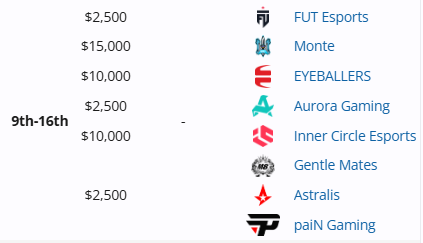 线上赛阶段的第9-16名队伍当中,除固定的26,250美元俱乐部奖金外,Monte获得最多的1.5万美元选手奖金,EYEBALLERS和InnerCircle各获得1万美元,FUT、Aurora、Astralis、paiN和GentleMates均只获得2500美元。