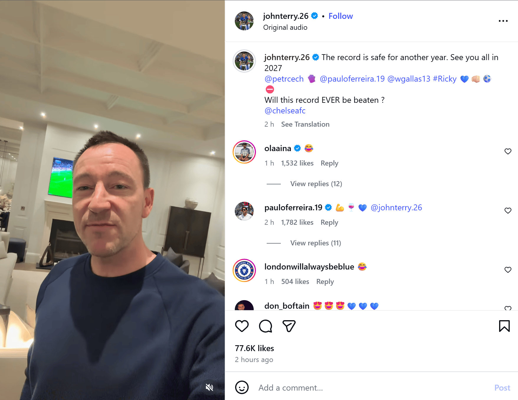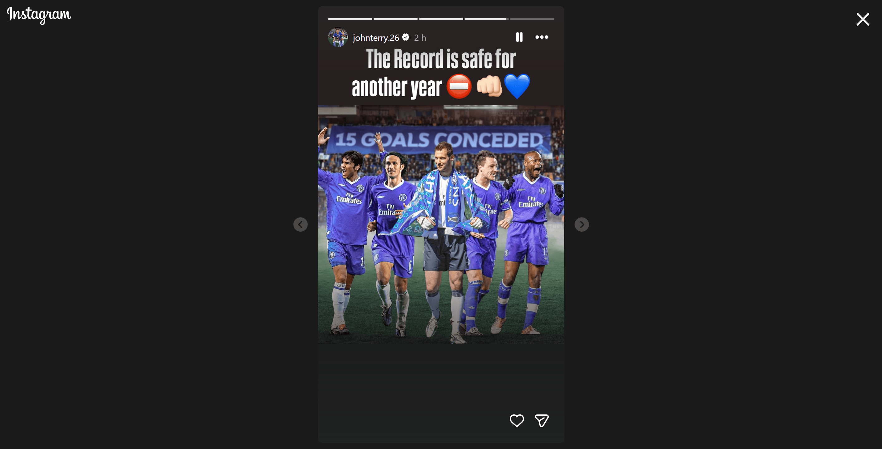 在随后发布的一段Instagram视频中,特里进一步表示:“2026年1月25日,这项纪录依然安全。曼联2-1领先阿森纳,虽然还有25分钟,但纪录已经稳了,又能再保持一个赛季。所以切赫、保罗-费雷拉、卡瓦略、加拉,是时候开瓶酒或者倒一杯红酒庆祝了。我今晚直接来一整瓶庆祝。不过兄弟们也可以告诉我,你们觉得单赛季只丢15球的纪录还能被打破吗?我认为不可能。”