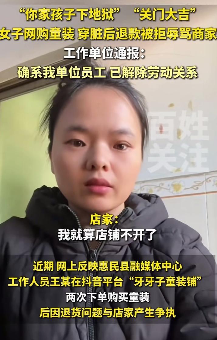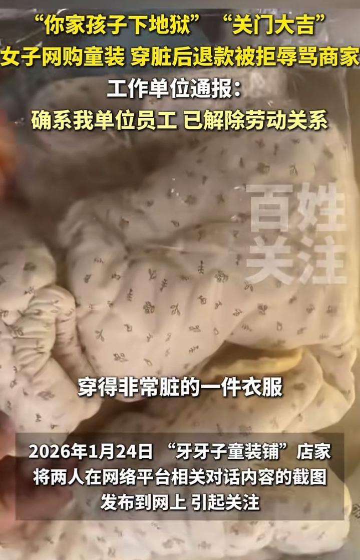 穿脏童装还想全额退?骂商家孩子下地狱的她,终于结果让人大快人心 一件穿得发黑的童装,背后是人心最丑陋的算计。 这位女子买了童装穿脏后申请退款,被平台驳回6次,竟恼羞成怒诅咒商家“孩子下地狱”“店铺关门大吉”,甚至深夜追着商家辱骂。更讽刺的是,她还是当地融媒体中心的工作人员。 当商家宁愿关店也要曝光时,她才姗姗来迟地发视频“真诚道歉”,但单位通报来得更快——直接解除劳动关系。 网友怒了:“穿脏衣服想白嫖,骂完再卖惨,脸皮比城墙还厚!” 这件事撕开了某些人精致利己的面具:占不到便宜就撒泼,道歉只是为了保住饭碗。 底线从来不是用来突破的,成年人的每一次恶言恶行,最终都要自己买单。 社会热点 退货衣服
