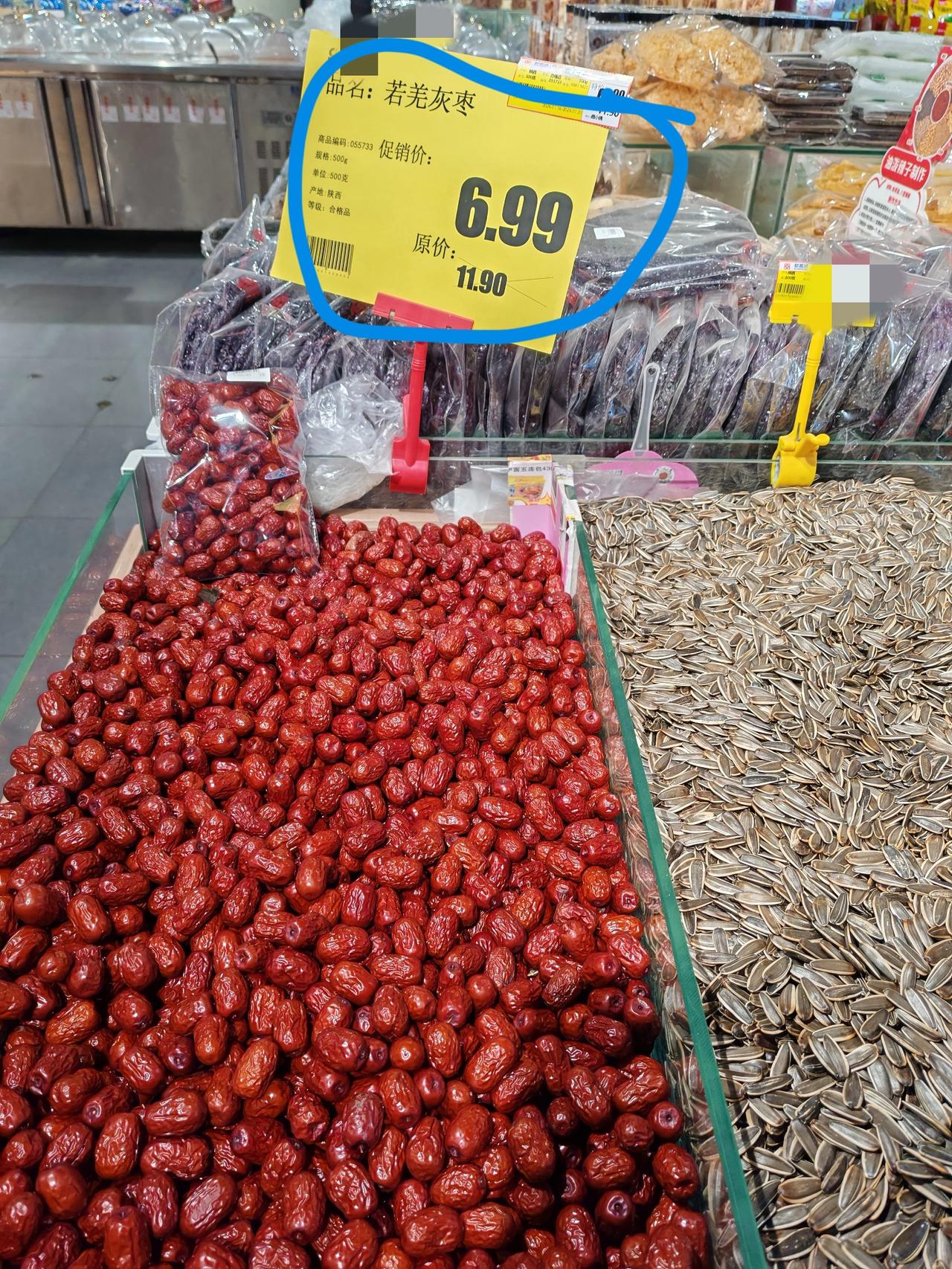 前两天我发文说新疆大枣卖不上价,有小伙伴不服气,说我拍的是早市上的次品,说那些枣身上皱巴巴的,好品质的疆枣还是不会低于10元1斤。 昨天我又进超市拍了一下这个红枣,若羌灰枣,如假包换的新疆红枣,见图2,价格为6.99元,原价标的11.9元,虽说是促销价,既然促销,说明并不好卖,这个价能卖,进一步说明批发价的确低。 而且评论区有小伙伴说红枣身上有皱纹,不是好枣,这个说法不大对,枣身上有皱纹只是水分流失了一些而已,只要枣体饱满,色泽自然,闻起来无异味,尝起来甜而不腻的就是好红枣。 多数农副产品价格下行是一个整体趋势,不是某一个产品的问题,是多方面因素共同作用的结果。