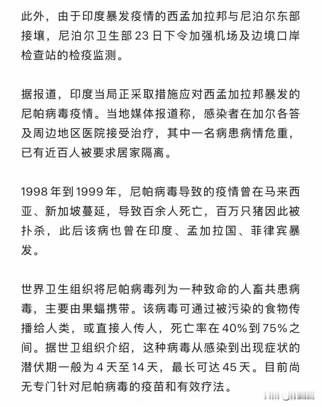 死亡率最高75%还能人传人!印度尼帕病毒暴发,泰国普吉机场紧急设防,该如何防范? 印度西孟加拉邦突发尼帕病毒疫情的消息传来,瞬间揪紧了不少人的心,这种致死率最高能到75%的病毒还能直接人传人,周边国家已经开始紧急行动,这波疫情的防控缺口到底该怎么堵上? 就在近期,印度官方确认西孟加拉邦出现尼帕病毒疫情,当地已经采取了对应的防控措施,有近百人被要求居家隔离,其中还有一名感染者的病情处于危重状态,正在医院接受针对性治疗。这一情况也立刻引发了周边国家的警惕,首当其冲的就是和印度有大量游客往来的泰国。 因为近期有不少印度游客前往泰国普吉岛观光,普吉国际机场已经第一时间升级了健康监测措施,对来自印度的入境游客加强筛查。机场方面的负责人也表示,目前正在向泰国疾控部门寻求专业指导,商议是否要在泰国全国的入境检查处,推行更多的额外防疫手段。不只是泰国,和印度西孟加拉邦接壤的尼泊尔,也在1月23日下令强化机场和边境口岸的检疫监测,严防病毒跨境传播。 可能还有不少人对尼帕病毒不太了解,这种病毒是世卫组织认定的致命人畜共患病,天然宿主是果蝠,除了通过污染的食物传播,还能直接人传人。更让人担忧的是,该病毒的潜伏期最短4天,最长能达到45天,而且直到现在,都没有研发出对应的特效疫苗和治疗方法,感染后的死亡率维持在40%到75%之间。 这轮印度尼帕病毒疫情的最新防控进展,集中在周边国家的口岸管控上。泰国普吉机场的健康监测已经落地,尼泊尔的边境检疫也全面升级,印度当地则对密切接触者开展居家隔离和健康监测。 面对这种高致死率的未知病毒,口岸防控成为了第一道防线,而暂时没有特效防控手段的尼帕病毒,也让不少人开始关注东南亚地区的防疫动向,后续的防控措施调整,也成了大家最关心的事。