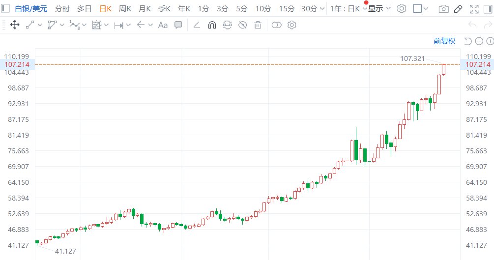 格隆汇1月26日|现货白银向上触及107美元/盎司,日内上涨3.67%,续创历史新高,本月累涨超35美元。