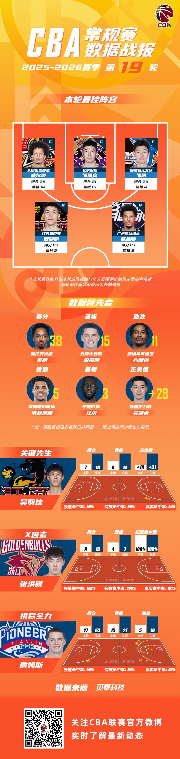 2025-2026赛季CBA联赛常规赛第19轮结束较量,来自吉林东北虎男篮的威尔逊,北京控股篮球俱乐部邹雨宸,福建浔兴SBS男篮的邹阳,江苏肯帝亚篮球俱乐部的庞峥麟和龙狮篮球俱乐部的威金顿入选CBA联赛常规赛第19轮最佳阵容!