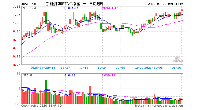 1月26日,新能源汽车ETF(516390)开盘涨0.37%,报1.071元。新能源汽车ETF(516390)重仓股方面,比亚迪开盘涨0.00%,宁德时代涨1.45%,汇川技术涨0.15%,三花智控涨0.00%,华友钴业涨1.86%,亿纬锂能涨1.92%,赣锋锂业涨2.21%,天赐材料涨1.11%,长安汽车涨0.00%,天齐锂业涨1.91%。