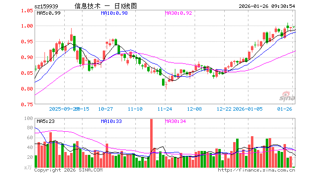 1月26日,信息技术ETF(159939)开盘涨0.20%,报0.996元。信息技术ETF(159939)重仓股方面,立讯精密开盘跌0.22%,寒武纪跌0.75%,工业富联跌0.03%,中芯国际跌0.76%,海光信息跌0.18%,北方华创跌0.44%,胜宏科技涨1.03%,京东方A涨0.67%,兆易创新涨0.93%,澜起科技跌1.14%。