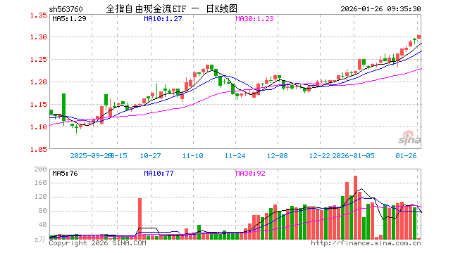 全指自由现金流ETF(563760)业绩比较基准为中证全指自由现金流指数收益率,管理人为中银基金管理有限公司,基金经理为赵建忠,成立(2025-05-21)以来回报为29.24%,近一个月回报为7.77%。