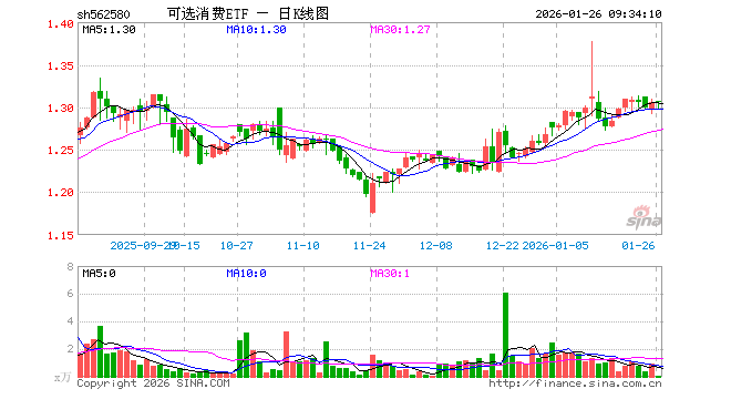 1月26日,可选消费ETF(562580)开盘涨0.15%,报1.307元。可选消费ETF(562580)重仓股方面,美的集团开盘涨0.03%,比亚迪涨0.00%,格力电器涨0.00%,三花智控涨0.00%,福耀玻璃涨0.08%,赛力斯跌0.42%,海尔智家涨0.00%,中国中免跌0.19%,上汽集团涨0.27%,拓普集团涨0.69%。