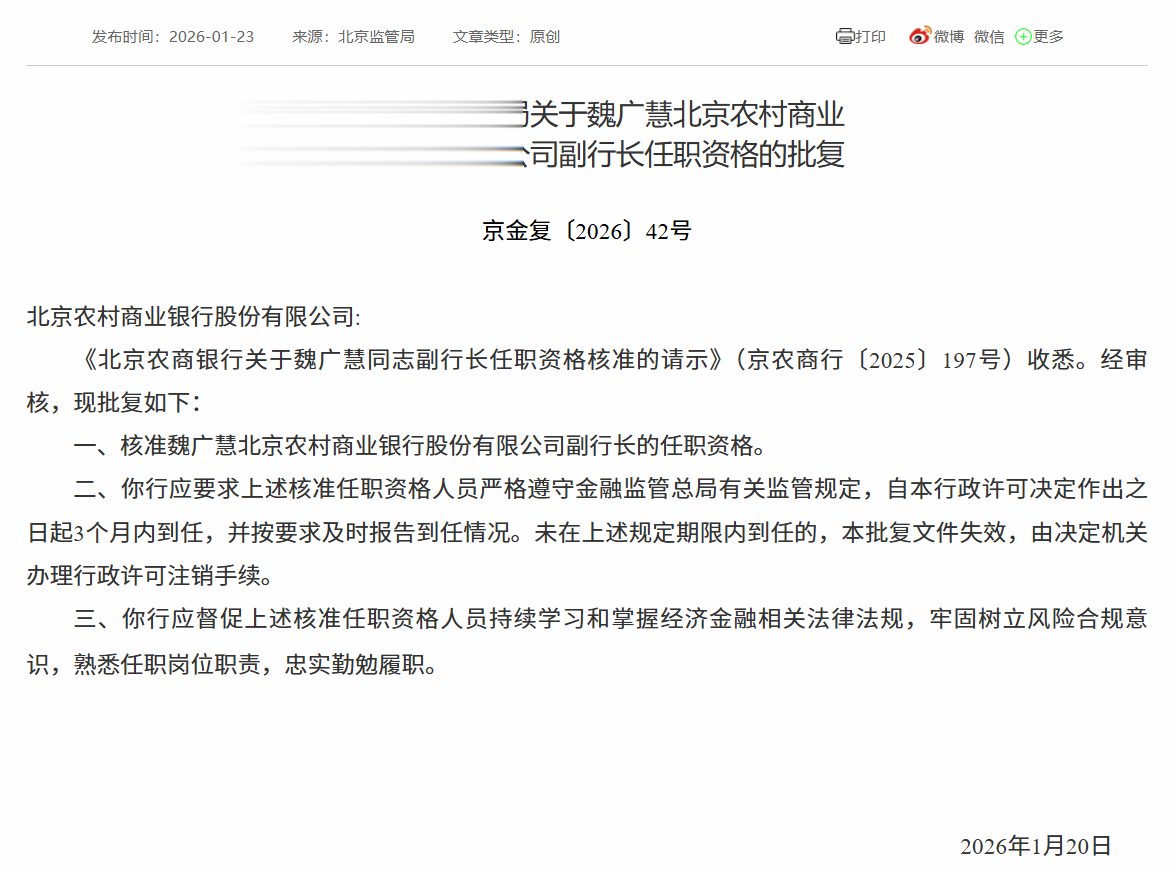1月26日金融一线消息,北京金融监管局日前发布《关于魏广慧北京农村商业银行股份有限公司副行长任职资格的批复》,核准魏广慧北京农村商业银行股份有限公司副行长的任职资格。
