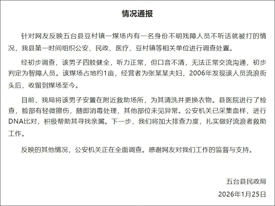 1月25日晚,山西五台县民政局发布情况通报称,针对网友反映五台县豆村镇一煤场内有一名身份不明残障人员不听话就被打的情况,该县第一时间组织公安、民政、医疗、豆村镇等相关单位进行调查处置。