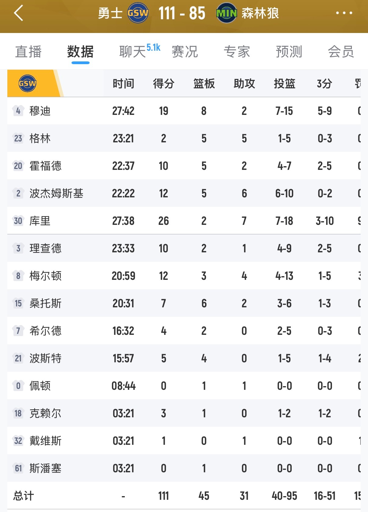 勇士队迫使对手出现26次失误,并利用这些失误得到24分,最终以111-85大胜,战绩提升至26胜21负。库里拿下26分7篮板,穆迪贡献19分8篮板。森林狼队面对勇士队严密的防守,投篮命中率仅为38%,这是自巴特勒右膝前交叉韧带撕裂以来,勇士队的首场胜利。