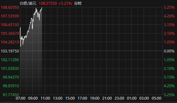 上证报中国证券网讯据Choice数据,1月26日,国际现货白银日内涨幅扩大至5%,截至10:32报108.58美元/盎司,涨5.21%。