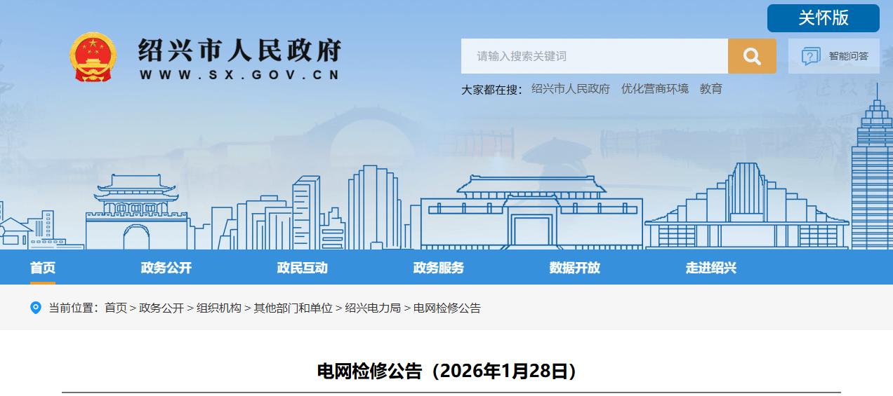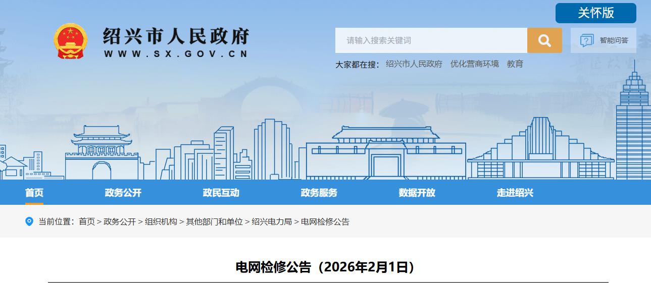 近日,绍兴市人民政府发布两则《电网检修公告(2026年1月28日)》、《电网检修公告(2026年2月1日)》: