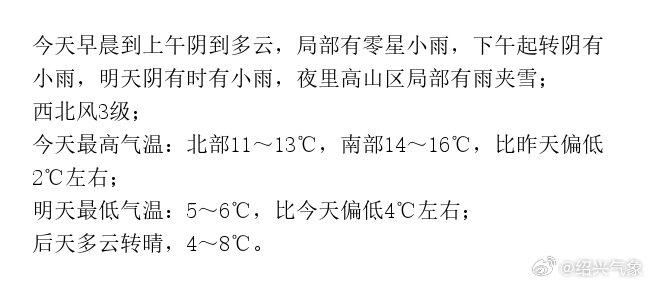 今天(1月26日),绍兴阴有小雨,气温呈现南高北低态势,北部地区最高气温10~11℃,南部地区12~14℃,最低气温则普遍在6~8℃之间。受持续阴雨影响,今日昼夜温差较小,但体感温度已然不暖。