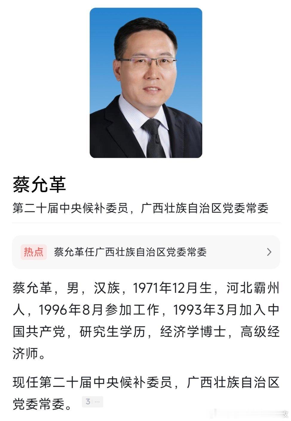 蔡允革任广西壮族自治区党委常委。