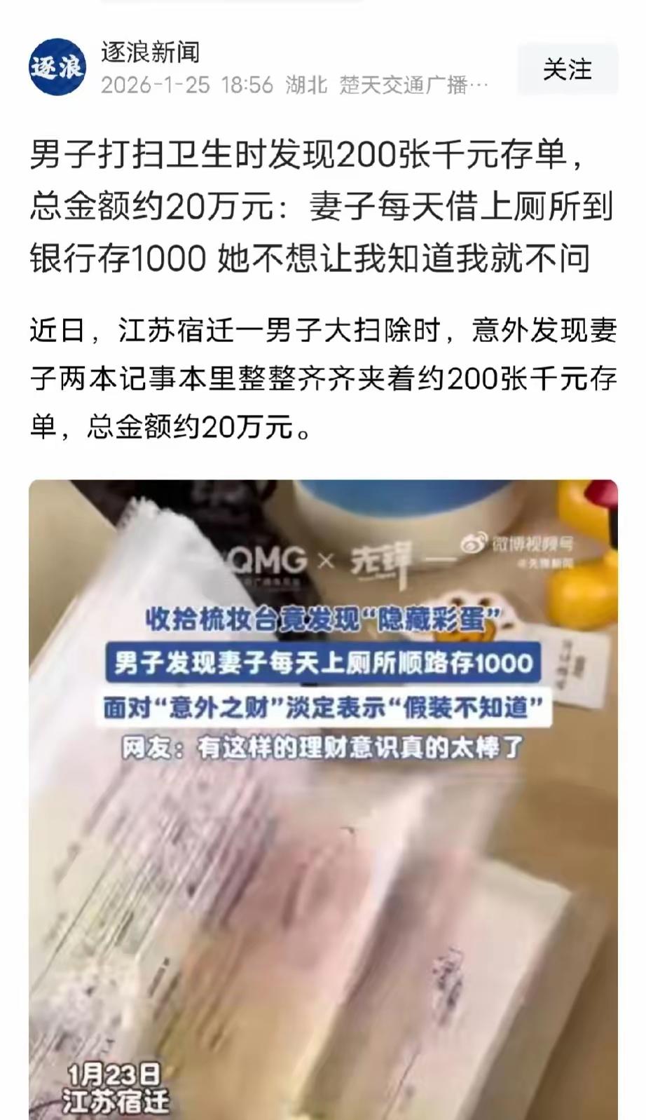 上厕所攒下20万!网友笑侃:这是把“厕所经济”玩到了极致 江苏宿迁苏先生大扫除时,意外翻出妻子藏的200张千元存单,一算竟有20万!原来妻子每天借着上厕所的名义,悄悄去隔壁银行存1000元,悄无声息就攒下了巨款。 苏先生嘴上说着假装不知道,转头就把这事儿晒到网上,网友直接笑疯:“全世界都知道了,就嫂子还蒙在鼓里!” 更有人花式调侃:“这哪是上厕所,分明是去搞专属‘厕所经济’,主打一个闷声干大事!” 也有网友酸了:“一天存1000,这家庭收入得有多高?” 这波操作堪称勤俭持家的天花板,藏钱的最高境界就是:我藏了,但没完全藏住;你发现了,但假装没发现。 社会热点 厕所经济学
