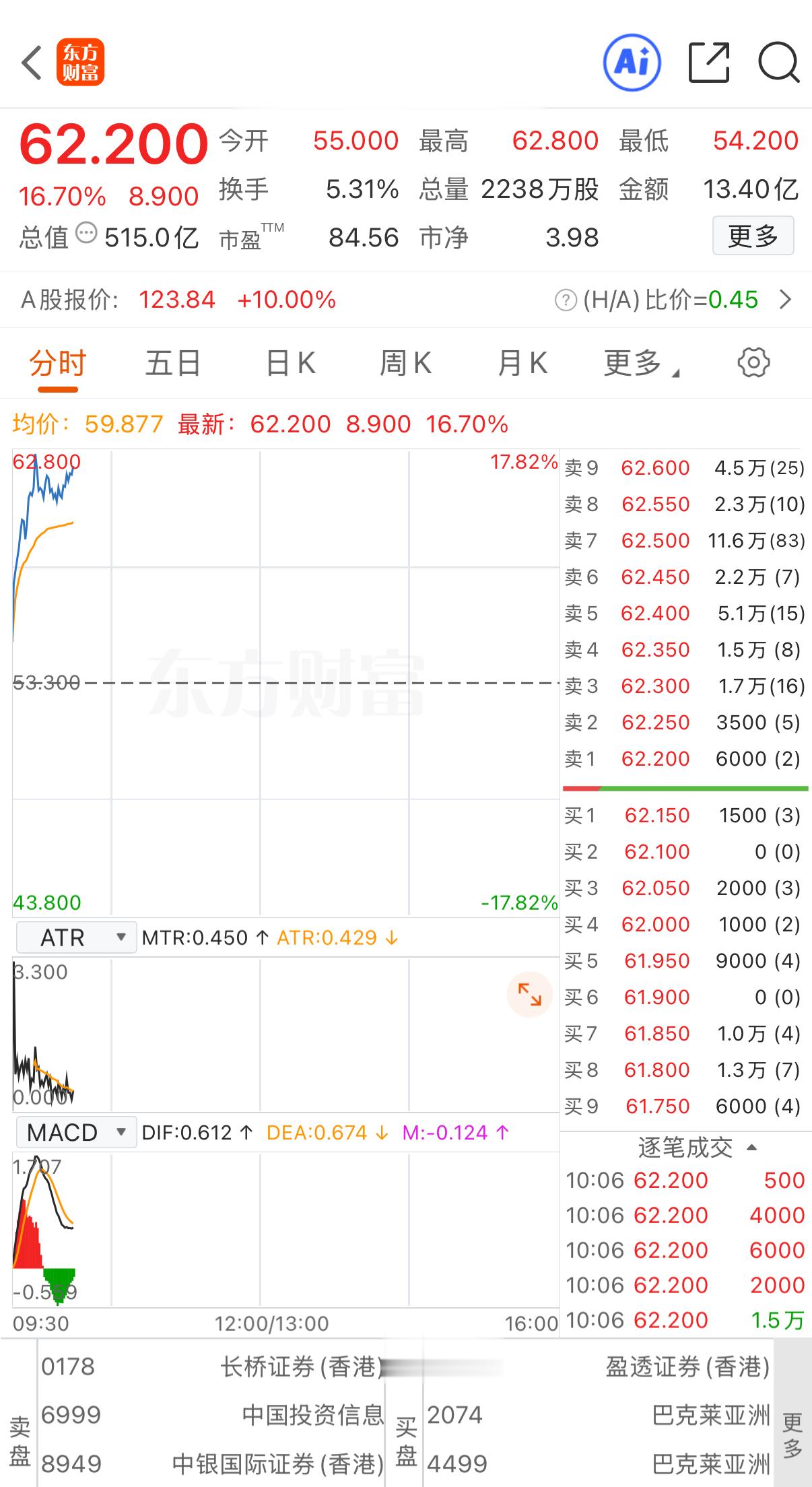 上证报中国证券网讯(记者何治民)1月26日,长飞光纤光缆高开高走,一度涨超17%。截至10时06分,该股涨16.70%,报62.20港元/股。