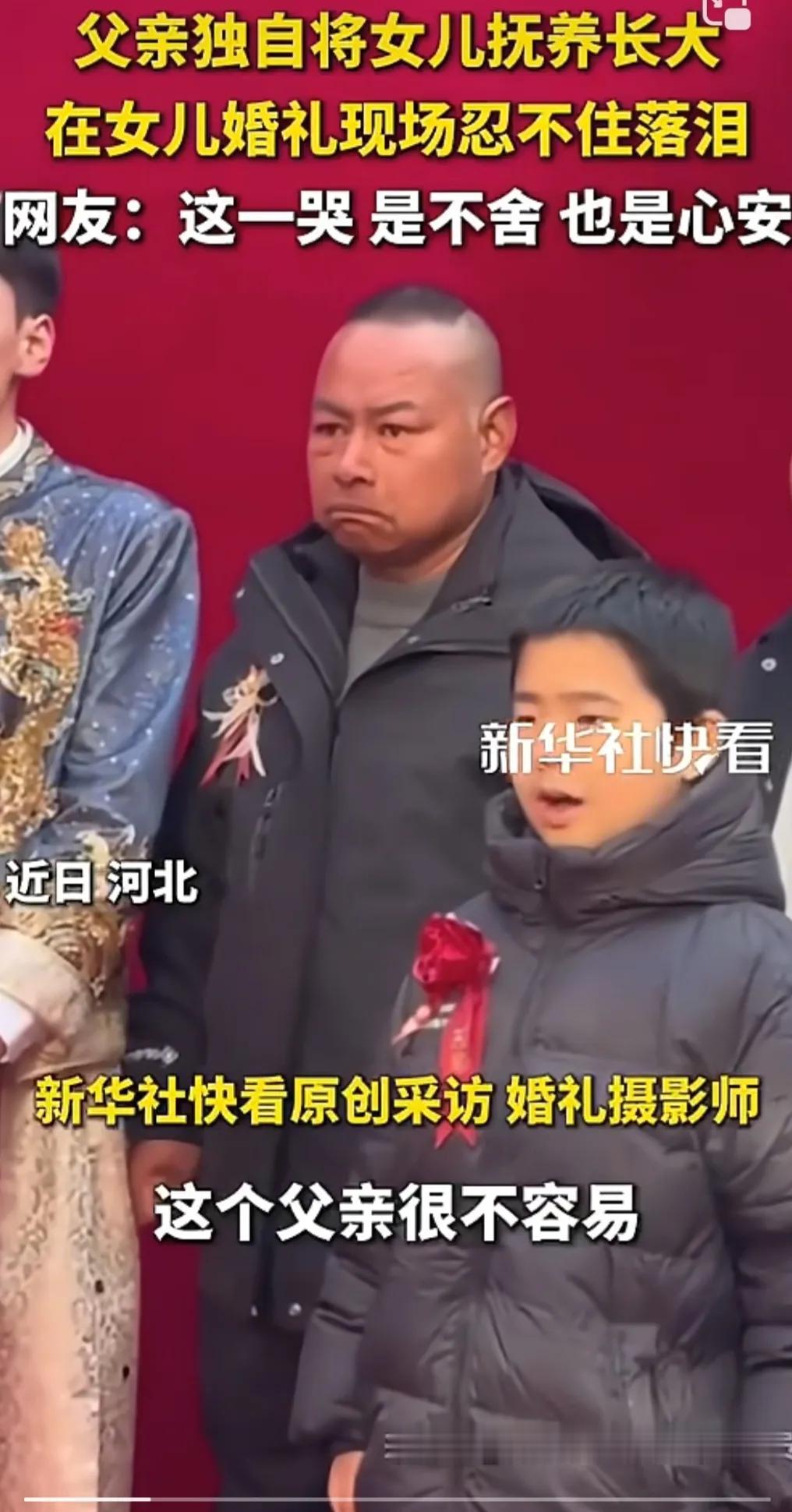 女儿出嫁,和女儿女婿拍照的时候,父亲忍不住哭了。 这个父亲很不容易,一个人养大女儿,又当爹又当妈,含辛茹苦养大的女儿,嫁人了,眼泪里全是不舍,女儿嫁的如意郎君,也是心安。