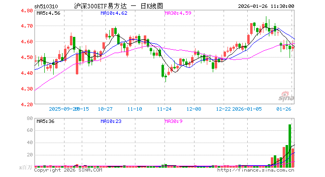 1月26日,截止午间收盘,沪深300ETF易方达(510310)涨0.33%,报4.563元,成交额139.73亿元。沪深300ETF易方达(510310)重仓股方面,宁德时代截止午盘跌1.13%,贵州茅台跌0.20%,中国平安涨1.85%,中际旭创涨0.38%,紫金矿业涨6.28%,招商银行涨1.47%,新易盛涨1.04%,美的集团跌0.16%,兴业银行跌0.94%,长江电力涨0.04%。