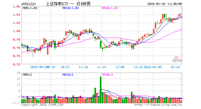 1月26日,截止午间收盘,上证指数ETF(510210)跌0.10%,报1.040元,成交额1.78亿元。上证指数ETF(510210)重仓股方面,农业银行截止午盘涨1.93%,中国石油涨5.29%,贵州茅台跌0.20%,工业富联跌1.48%,中国银行涨1.52%,紫金矿业涨6.28%,中国神华涨3.42%,中国人寿涨3.65%,招商银行涨1.47%,中国平安涨1.85%。
