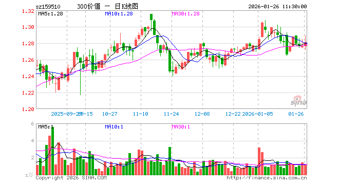 1月26日,截止午间收盘,沪深300价值ETF(159510)涨0.39%,报1.281元,成交额155.23万元。沪深300价值ETF(159510)重仓股方面,宁德时代截止午盘跌1.13%,贵州茅台跌0.20%,中国平安涨1.85%,招商银行涨1.47%,兴业银行跌0.94%,比亚迪跌1.06%,京东方A涨1.12%,长江电力涨0.04%,中国移动跌0.18%,海尔智家涨0.12%。