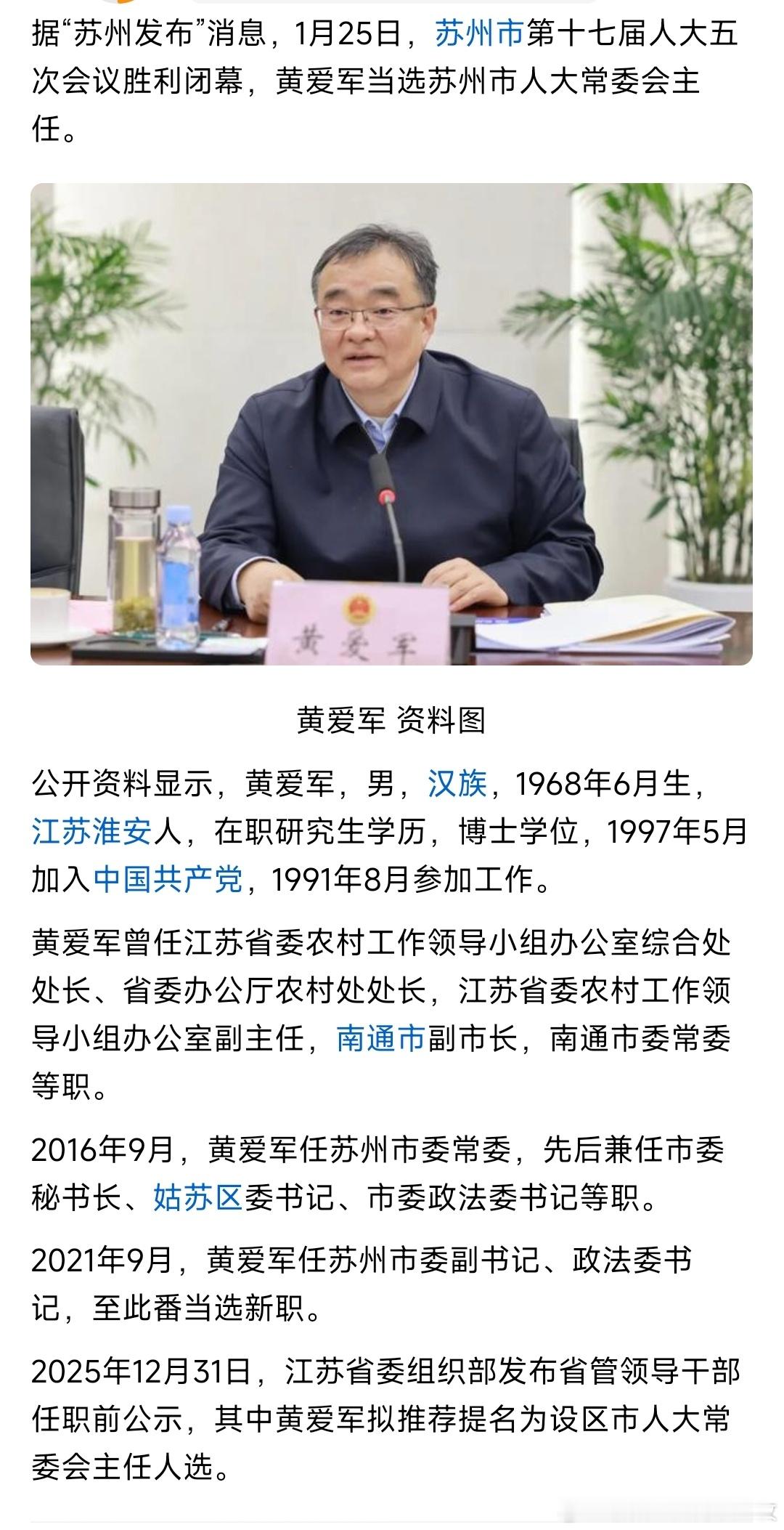 黄爱军当选苏州市人大常委会主任