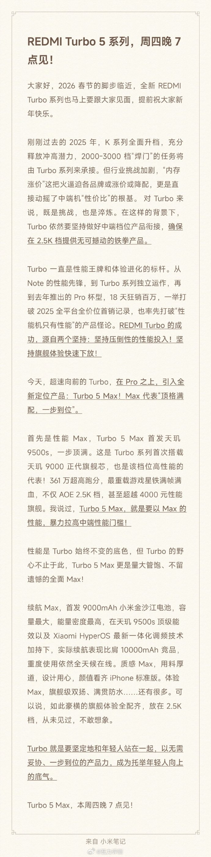 Turbo5Max 开始正式预热了,从卢伟冰的微博可以发现,正如我之前说的,Turbo提了一档,并且这可以说是官方认证的提档。它将接替K系列正面对抗友商的“性价比”攻势。2000-3000元是竞争非常激烈的战场,不仅所有品牌都有机器,而且还都不是1、2款,战况非常激烈。红米Turbo 5 Max想在这里面打赢,必须在基础配置和用料上做足准备。这次先把天玑9500s给拿出来了,这已经算是旗舰级的芯片了,放在去年,都是大旗舰才会用的东西。从性能表现上来说,把它放在2500左右的机器里,已经不需要担心任何性能问题了。另外电池他们也做到了9000mAh,充电问题更不用担心,目前市场上充电最友好的品牌就是小米和苹果,根本不用为充电头操心。Turbo 5 Max这一波从产品力上来说,完全不输那些骁龙8 Gen5的机器,现在就等一个具体价格了。