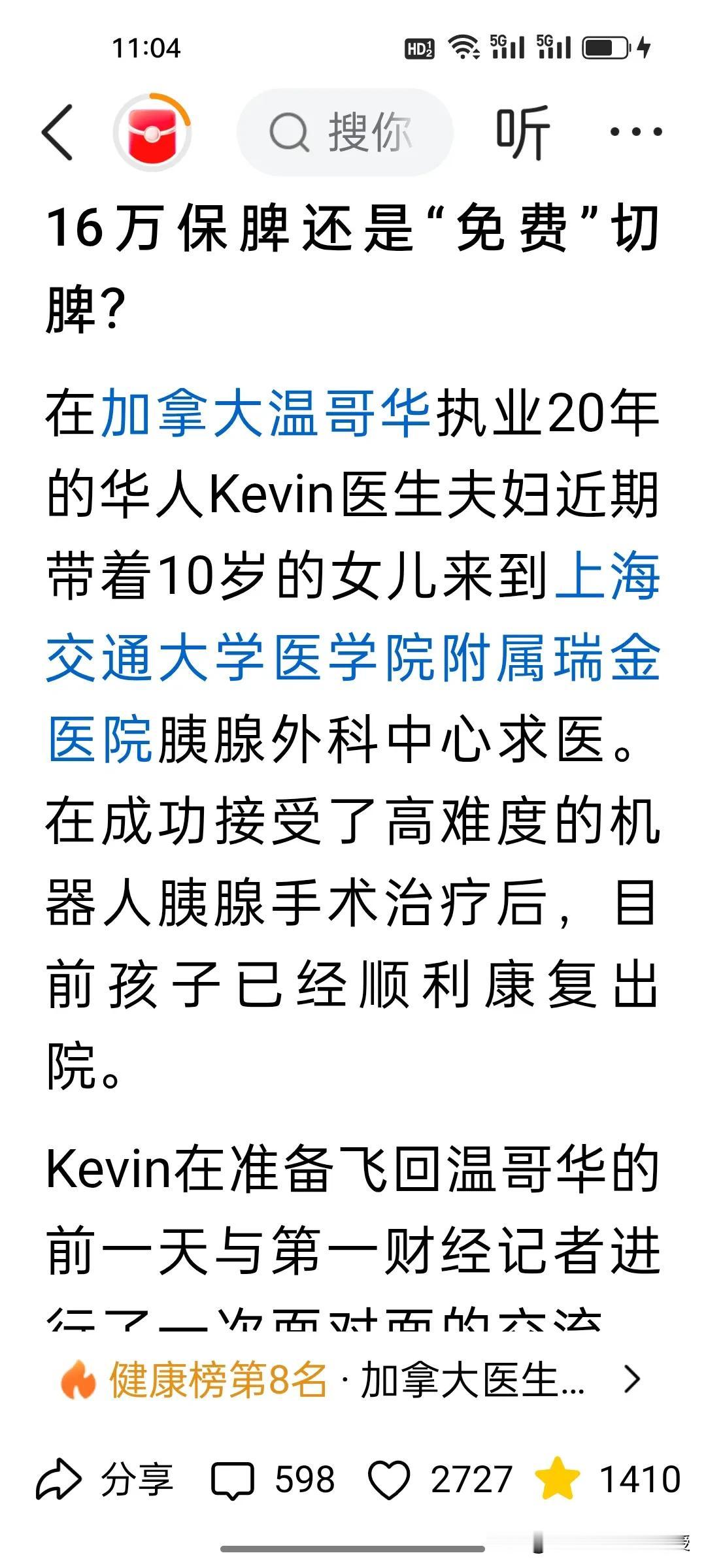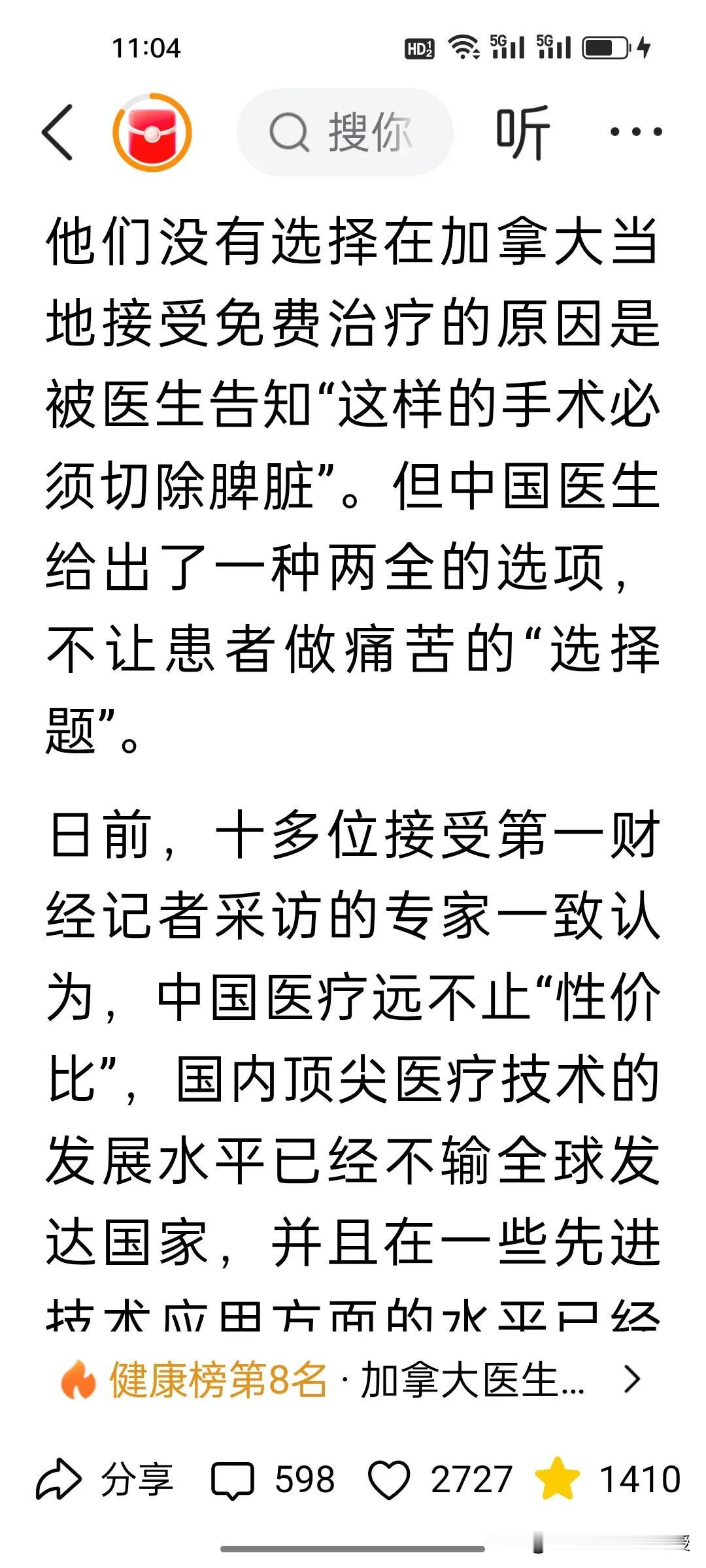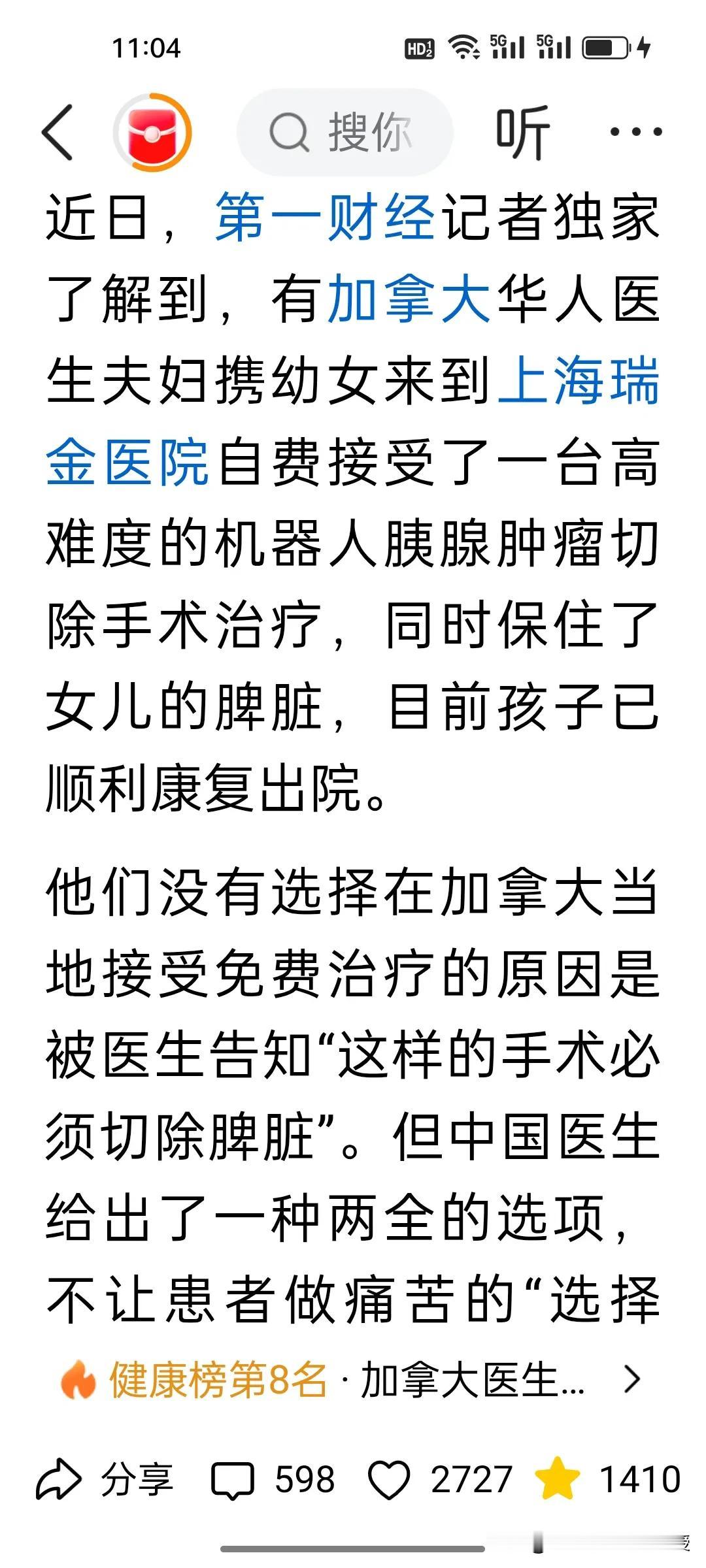 谁能想到,加拿大夫妇拒绝本国免费手术,竟打飞的来中国花16万做手术! 加拿大华人医生夫妇带10岁患罕见肿瘤的女儿来中国求医,加拿大做手术可是免费的,可是他们拒绝了加拿大的切脾方案,远赴上海瑞金医院,花16万做机器人微创手术,成功切瘤保脾。瑞金医院胰腺外科国际部每月仅开放20个外籍名额,却一号难求。 曾几何时,国人扎堆赴海外求医,如今中国医疗凭顶尖技术、先进理念,让老外争相来华。这台高难度手术,是瑞金团队500+同类案例的积淀,更是中国医疗实力跻身国际顶尖的最好证明。 中国医疗体系完善,早已不是只赢在性价比!