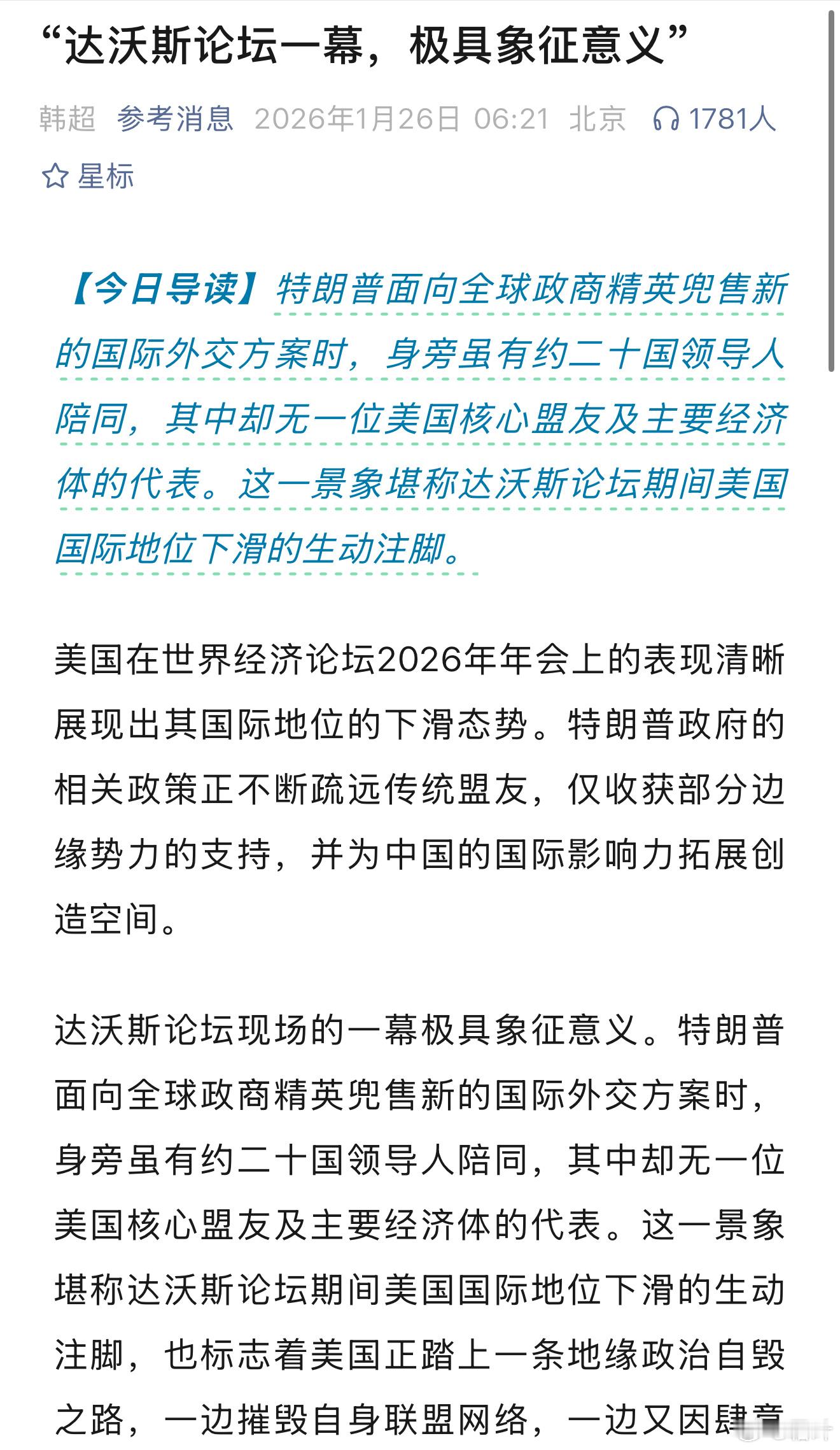 2026达沃斯论坛最具象征意义:阿川公开羞辱盟友、否定多边秩序,甚至将格陵兰岛称为“美国核心利益”,其狂言乱语与论坛“对话的精神”形成尖锐对立瞬间撕裂了西方同盟的脆弱表象?