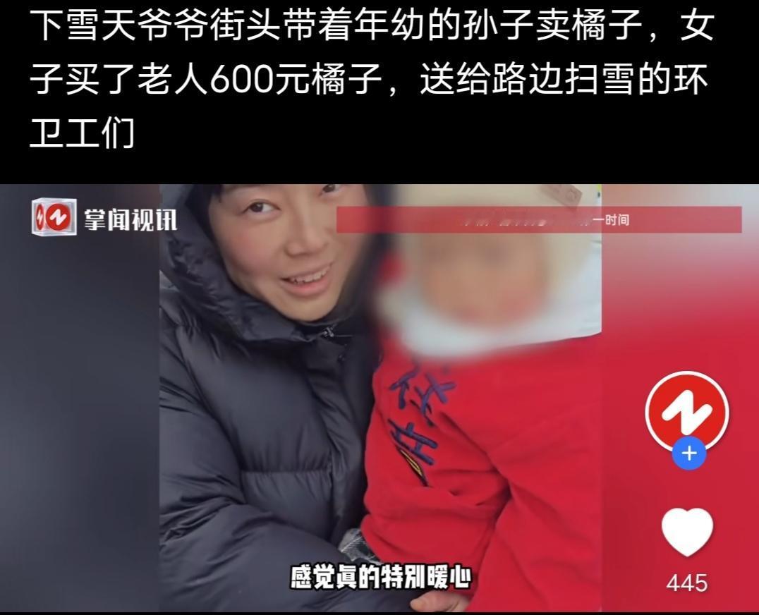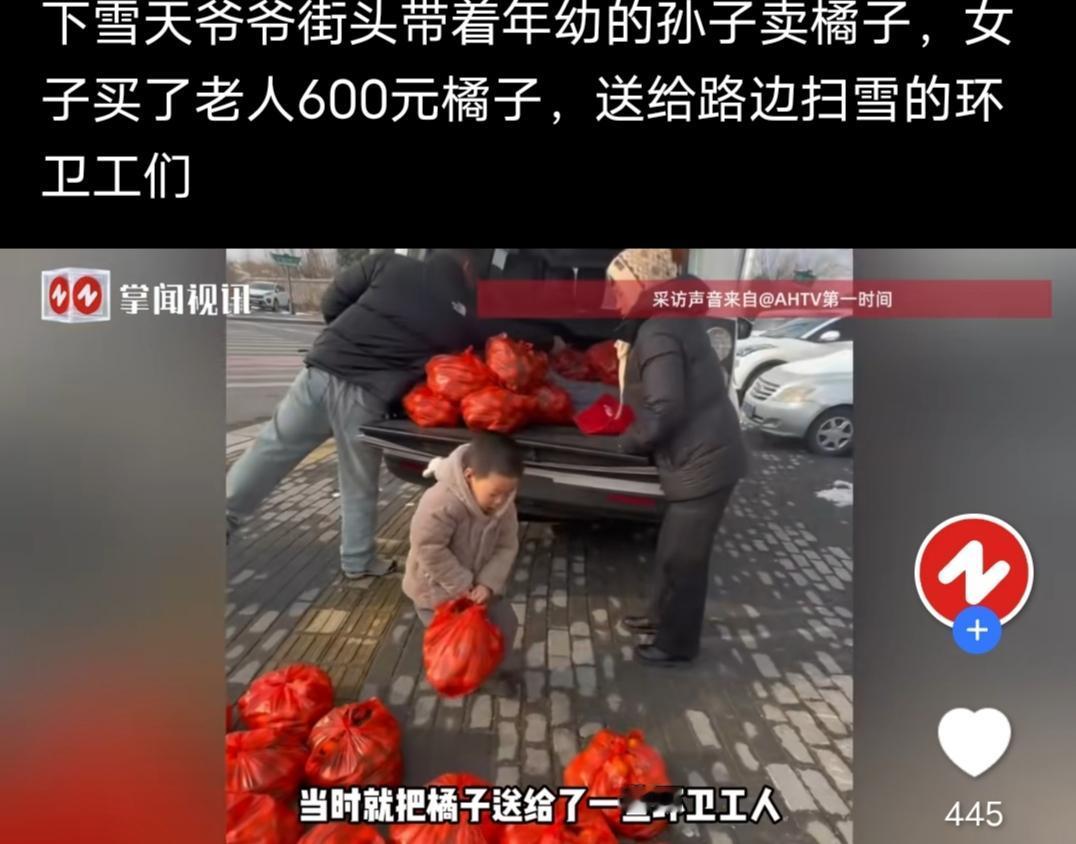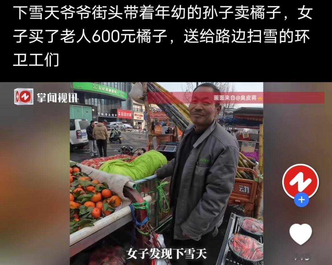 寒冬里的温暖一幕! 来自掌闻视讯安徽广播电视台经济生活频道发布的消息,近日,河南洛阳蒋女士,在街头看到一个老人家,在下雪天的街头带着年幼的孙子卖橘子,蒋女士看着孩子觉得特别心疼,这么小的孩子,冰天雪地跟着来受冻,蒋女士还觉得孩子很可爱,还抱了孩子,爷爷说,平时都不会让人抱的,可能看着蒋女士面善,就让她抱了,孩子的爸爸也在摆摊,孩子的妈妈有精神病,所以只好跟着爷爷出来,蒋女士被爷爷对她人品的肯定,心里觉得很温暖,就想献点爱心,于是买了老人600元橘子,本来是打算回家做罐头的,但是路边又偶遇了扫雪的环卫工人,便又分发给了环卫工人们。 蒋女士,真的是位热心又善良的人,相信老人心里也觉得特别温暖,可以早点手工了。 说到下雪天摆摊,我想起了我刚毕业那几年,没找到专业对口的工作,后来便去了PICC,干起了保险经纪人。那是几个同事一起出门跑单,挺有干劲,在公交车上都会随机找陌生人填调查问卷的。有一年冬天,也是大白天下起了纷纷片片的雪,但是我们并没有打乱计划,还是照原计划去约定地点摆点。寒风刺骨雪花漫天,那个冷不光是一个冷字就能形容的, 什么东西都是冰冷的,手在雪风中,真的是寒冷刺骨地痛。 所以,蒋女士给大爷和环卫工人们送的温暖,可以让他们开心好几天,温暖好久好久。 祝愿努力生活的人日子越来越好,祝愿蒋女士,好人一生平安!