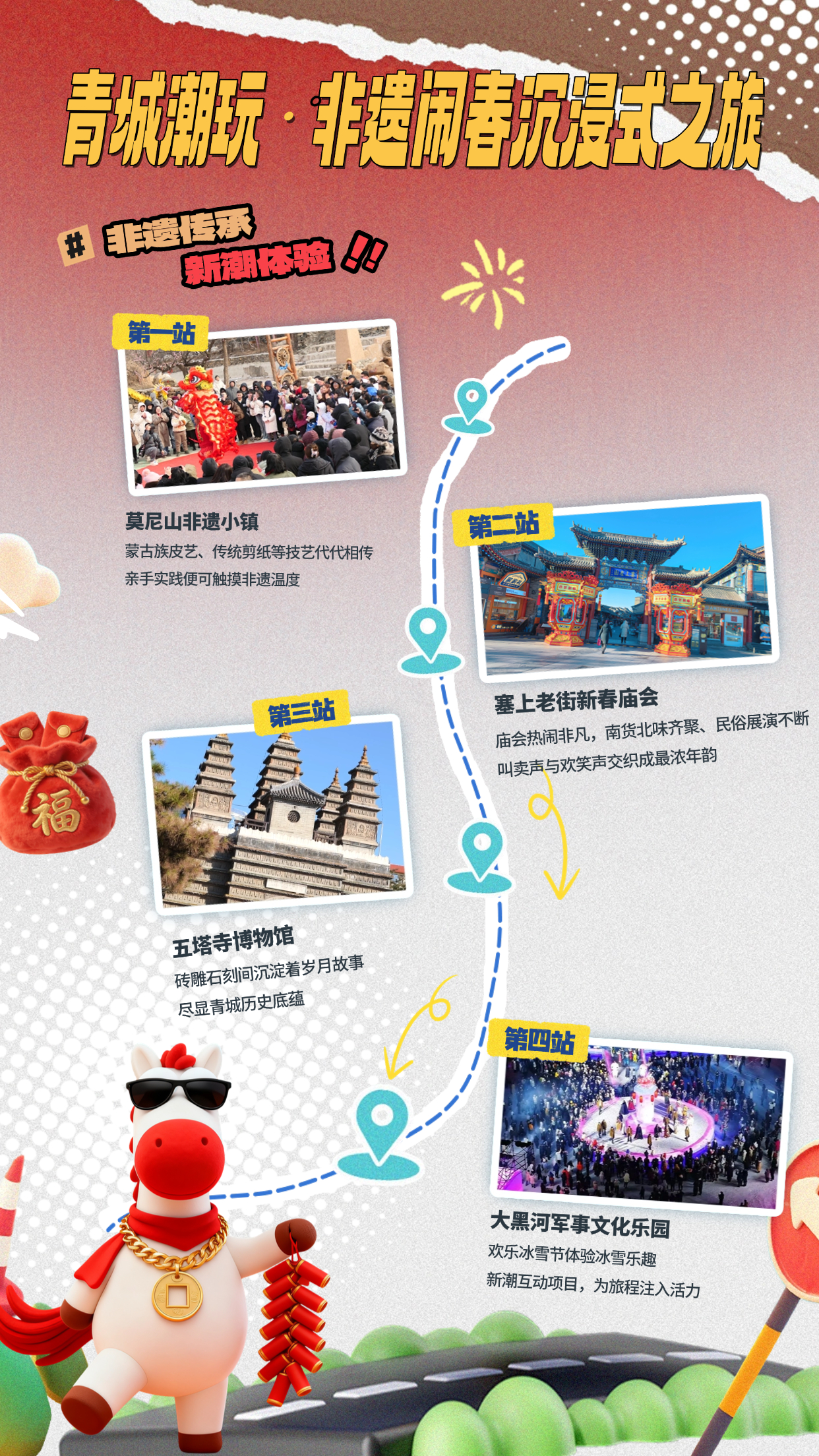 齐呼e起 向美而行2026年1月24日晚“2026来内蒙古过大年”系列活动在呼和浩特大黑河军事文化乐园启动。现场12个盟市代表共燃团圆篝火,马头琴演奏与群众舞蹈交替上演,市民游客参与非遗火群舞等环节,掀起新春氛围全民参与的城市总动员,温暖祥和的节日氛围获热烈响应。呼和浩特推出四条贴近百姓生活的新春主题线路:草原马文化深度之旅串联博物馆特展与草原马术体验,非遗闹春沉浸式之旅涵盖莫尼山非遗小镇与塞上老街庙会,冰雪童趣亲子之旅覆盖13个特色冰雪场地,文博寻味之旅串联博物院与老巷弄,尽显青城多元年味。青春遇见青城