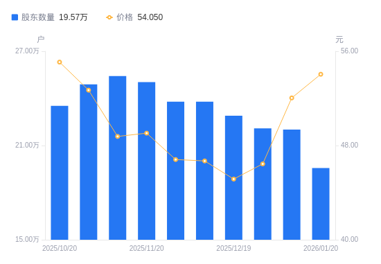 日期A股户数(户)流通A股户均持股数(股)户均持股市值(万元)2026-01-201956655423.6629.312026-01-092201514820.4225.092025-12-312209744802.4722.302025-12-192289984634.1920.922025-12-102379034460.7320.832025-11-282378784461.2020.882025-11-202503934238.2220.792025-11-102542424174.0620.362025-10-312489274263.1822.472025-10-202352324511.3824.85