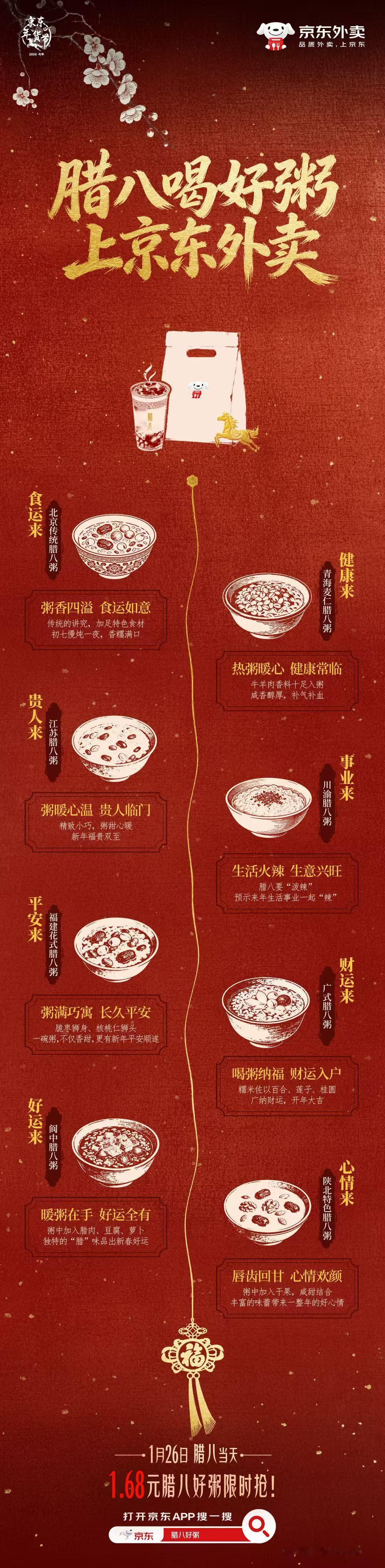腊八这碗粥,真是把两代人的快乐焊死在餐桌上了!早上和爸妈在家过腊八,懒得熬粥直接点了京东外卖的传统养生粥,料足味醇,喝一口就是熟悉的年味儿仪式感。上班和同事拼了杯奶茶粥,芋圆珍珠随便加,解锁加料自由的快乐,这才是咱们年轻人的腊八智慧~重点是今天线下还有惊喜!北京京东mall和雍和宫附近的派送点,京东外卖直接派发红运粥袋!路过打卡还能领到新年第一份福气,暖乎乎的粥+红运buff直接拉满,必须给这种暖心操作点个赞!偷偷告诉你,现在1.68元就能抢粥,近百款粥品一件免运,11城都用加热餐箱配送,拿到手还带着20℃的热气!不光腊八,平时点粥、点奶茶也全靠它,品类全、价更优,暖胃又省心~打开京东APP搜“腊八好粥”就能直接冲,腊八喝好粥就上京东外卖!快戳网页链接 参与活动吧!线下打卡也别忘了晒单哦~京东腊八 腊八好粥 年轻人的腊八粥 一代人有一代人的腊八粥热粥暖身红运满程 腊八腊八粥