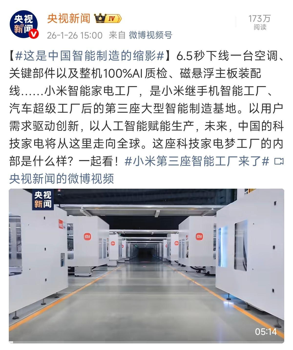 小米第三座智能工厂来了当你读完这句话,小米智能家电工厂已经下线了一台空调。“6.5 秒一套空调”不是PPT,是实打实的产线效率。到现在为止,小米已经手握手机、汽车、大家电三座工厂,而且不是代工,是完整的产研一体。并且小米还是国家级智能制造标杆企业,妥妥的“智造国家队”,做大家电已经不是跨界,是降维。回头看小米这条路,其实就是中国智造从追赶到领先的缩影:人、车、家三大赛道齐头并进,这两年小米的成长速度已经不是“稳”,而是“快”。大家电的持续高增长,说明科技家电这条路走通了,而自建工厂,本身就是All in的决心。为什么小米敢把空调全品类拉到10年包修?底气就在工厂。品质可控、产能可控,再叠加出海增长,质疑的声音已经明显跟不上小米前进的速度了。关键零部件100% AI质检、极端环境验证、自研自产的首款中央空调即将登场,自动化水平直接对标汽车工厂,制造公差压到±0.05mm。这座工厂不是炫技,是小米给家电行业交的一张“实力牌”。为小米大家电工厂点赞!