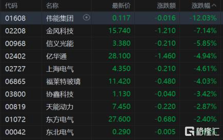 电力设备股回调,金风科技跌超7%,信义光能跌超5%,亿华通、上海电气、福莱特玻璃等跟跌。
