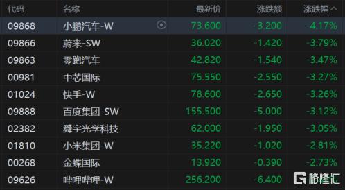 权重科技股多数呈现下跌行情,其中小鹏汽车跌超4%,蔚来、零跑汽车、中芯国际、快手、百度跌超3%,腾讯、京东飘红。