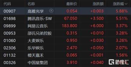 影视娱乐股涨幅居前,高雅光学、腾讯音乐-SW涨超5%,网易云音乐、大麦娱乐涨超3%,乐华娱乐、中国星集团等跟涨。