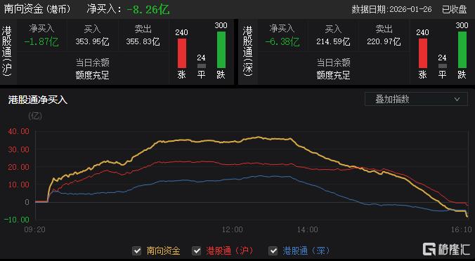 今日,南向资金净卖出8.26亿港元,其中港股通(沪)净卖出1.87亿港元,港股通(深)净卖出6.38亿港元。