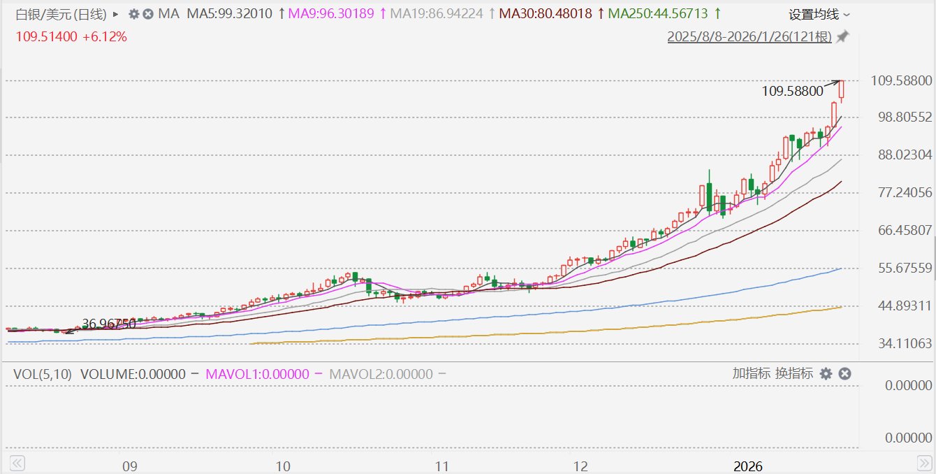 格隆汇1月26日|现货白银日内涨幅扩大至超6%,至109.5880美元/盎司,续创新高。纽约期银日内大涨8.00%,现报109.44美元/盎司。