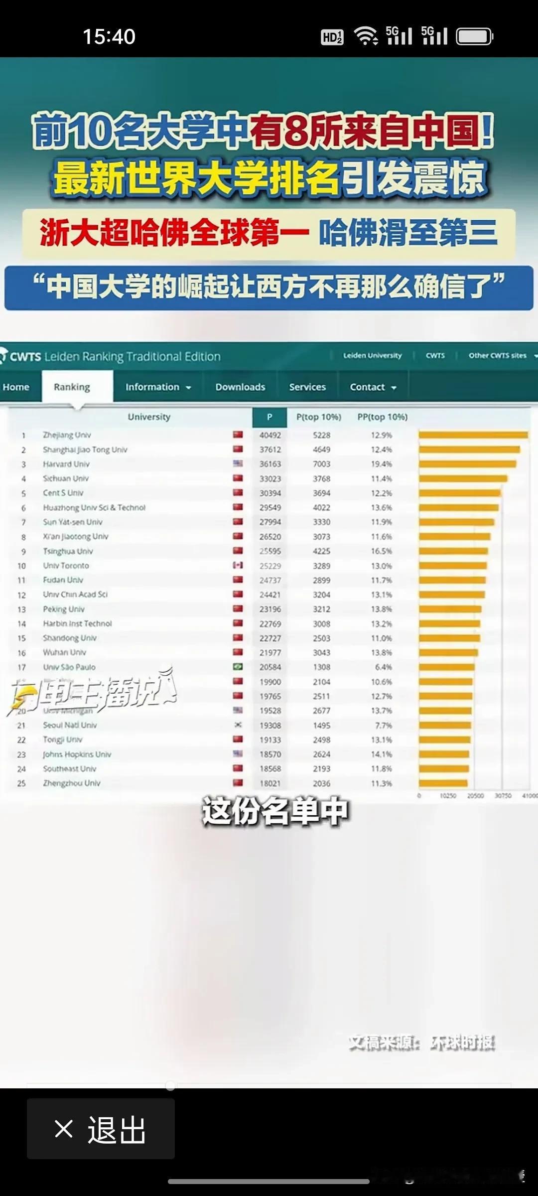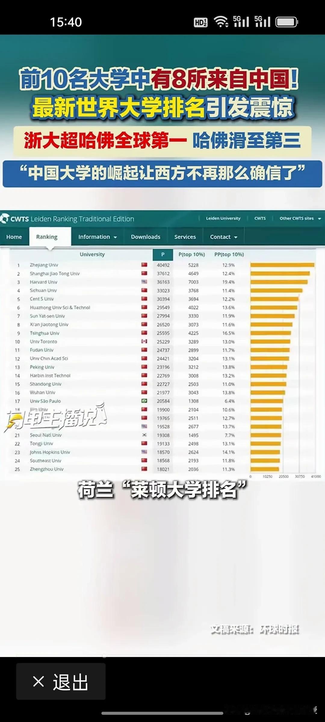 浙大超越哈佛登顶全球,中国高校的逆袭有多猛? 刚刚看到最新的CWTS莱顿世界大学排名,让人为之一震,浙江大学以40492篇论文总量力压哈佛,登顶全球第一,前十榜单里更有8所中国高校入围。 这不仅是单个学校的胜利,更是中国高等教育厚积薄发的见证。从论文数量到科研投入,从人才培养到国际影响力,中国高校正在用实力打破西方对学术话语权的垄断,让“中国大学的崛起让西方不再那么确信了”成为现实。 当浙大站上世界之巅,我们看到的不只是排名的变化,更是中国科教兴国战略结出的硕果。 从DeepSeek创始人,浙大信息与电子工程学系本科、硕士梁文锋,到无数深耕科技、实业的浙大人,正把论文写在祖国大地上,把成果转化为硬核生产力。 中国高校的逆袭,从来不是纸上排名,而是一代又一代学子用实干撑起的民族底气。