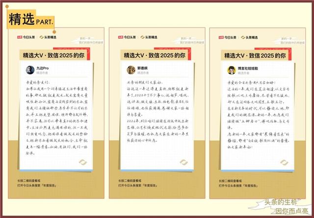 除“作者来信”这一重磅板块外,年鉴其他板块同样亮点纷呈。“精选年鉴”板块汇编全年重磅报道,从DeepSeek大模型爆火到伊以冲突升级,一篇篇深度好文彰显“头条精选”的优质内容品相,让用户在回顾中感受个体与世界的深度连接。用户@直爽张姐感慨:“原来我的每一次阅读都被记得”“从今日头条里关心世界大事”。