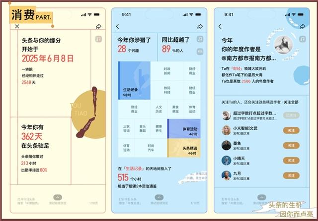 “全年头条使用数据”板块以具象化表达增强趣味性,将阅读时长转化为“阅读x本资治通鉴”,通过出勤率、兴趣占比等数据满足用户分享需求。用户@雨欣向阳晒出218小时的生活记录时长:“相当于雨声漫过27个日夜,头条的细致太暖心了。”