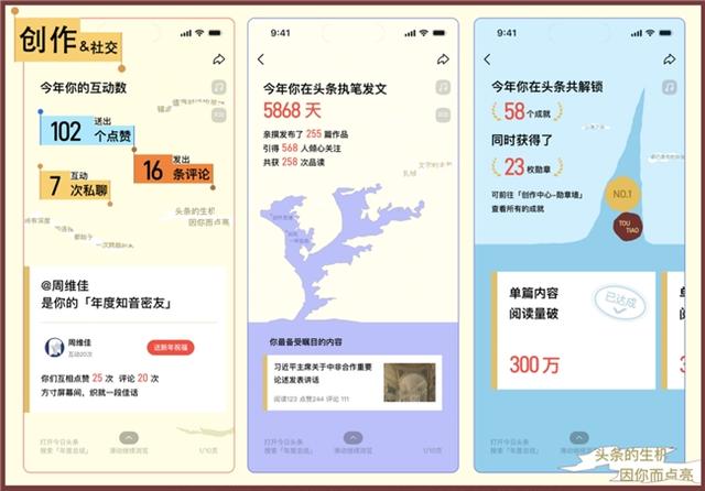 针对创作者与社交场景的优化的板块也备受关注。新增“年度作者页”强化了读者与作者的羁绊,用户@康君0n0y被“你的支持化作Ta笔下的星辰大海”戳中:“读者与作者的相遇本就是双向奔赴”;“数字荣耀”板块将创作与社交数据转化为勋章成就,用户@玉儿分享:“282天投稿攒下26枚勋章,收获1万粉丝,这是热爱与文字碰撞的荣光”;“年度密友”板块唤醒社交温情,用户@爱笑的星星6记录下暖心故事:“从兴趣相投到云端密友,在头条‘捡’漏捡到了最珍贵的陪伴”。