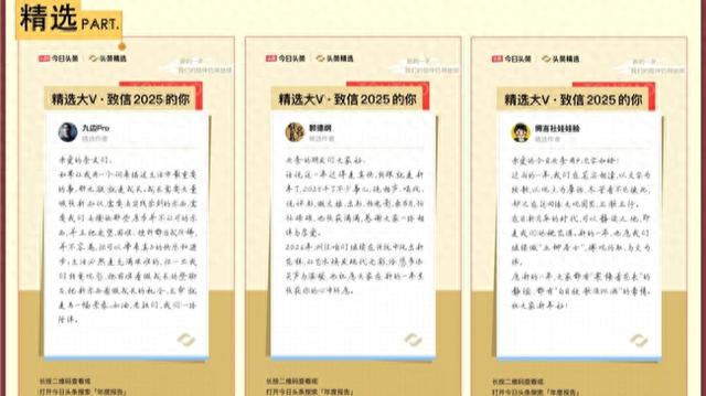 本次年鉴活动以“传递优质内容价值,强化平台归属感”为核心,集结全站资源打造多个特色板块,全方位呈现用户的年度头条记忆。作为核心亮点的“头条精选作者致信2025”模块,创新采用信件对话形式,官方邀约郭德纲、九边Pro、戴建业、倪萍等12位头部精选作者,分享年度寄语与专属关键词,用文字构建起名人作者与普通用户的温情联结。该模块不仅产出多篇百万+爆款内容,总阅读量突破千万,更引发全网热议,成为活动的核心传播引擎。
