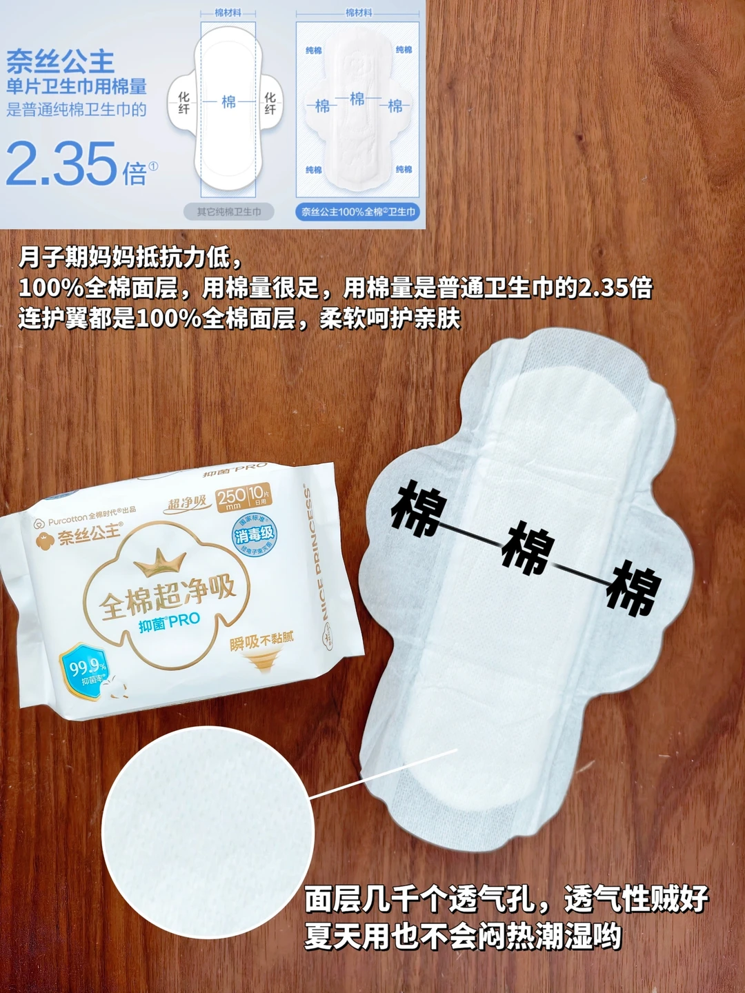 这款还升级了100%全棉面层,用棉量☁️是普通卫生巾的2.35倍,柔软亲肤的同时还更透气了,顺产有伤口也能放心用,而且产后那几天基本都是在床上🛏躺着、坐着,最怕的就是闷、潮、不舒服,这个面层上有上千个透气孔很透气,伤口那块不会一直捂着,用着很干爽。250mm和290mm可以都备点,搭配着用