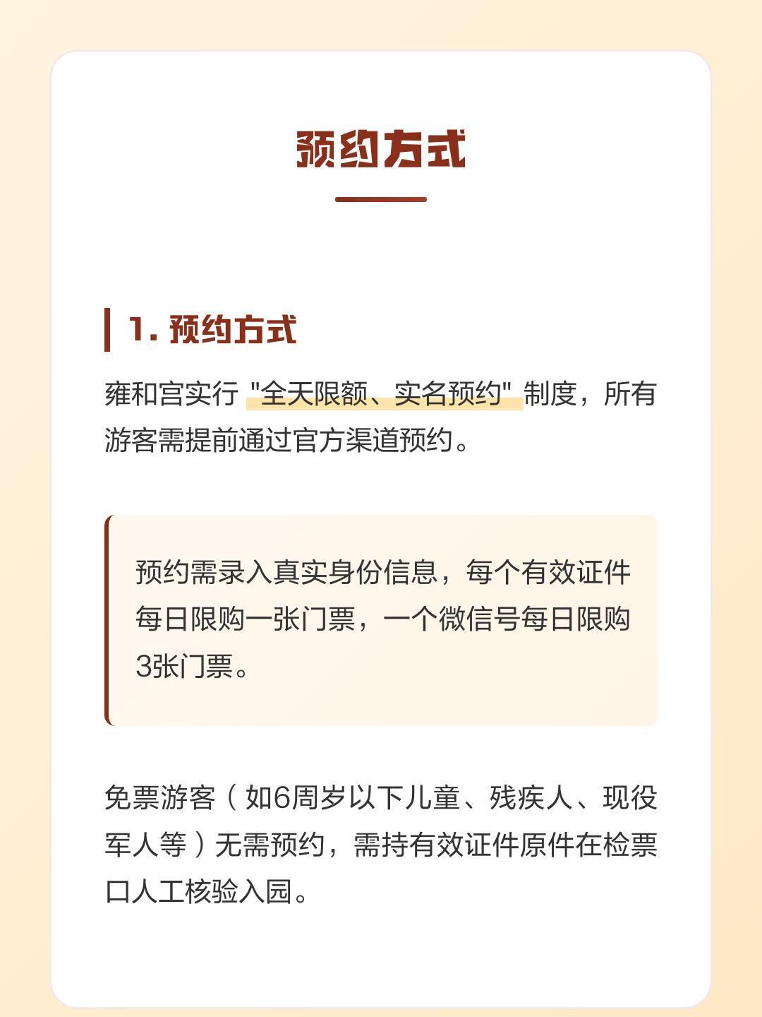 外国游客被雍和宫祈福机器人惊呆 雍和宫实行全天限额、实名预约制度。所有游客需提前通过官方渠道预约。预约需录入真实身份信息。每个有效证件每日限购一张门票。一个微信号每日限购3张门票。享受免票政策的游客(如6周岁以下儿童、残疾人、现役军人等)无需预约,但需持有效证件原件在检票口人工核验入园。