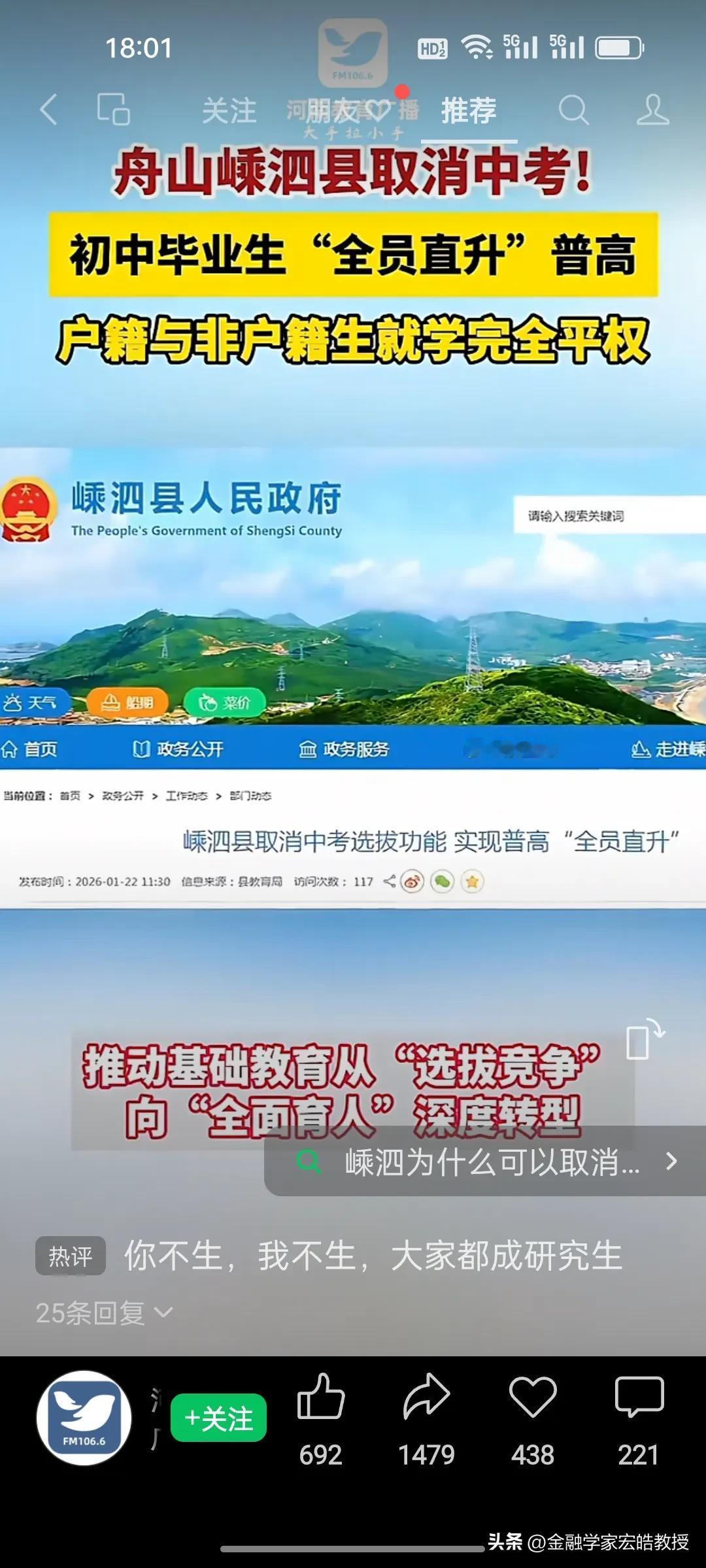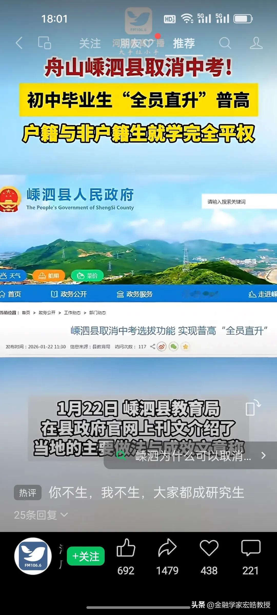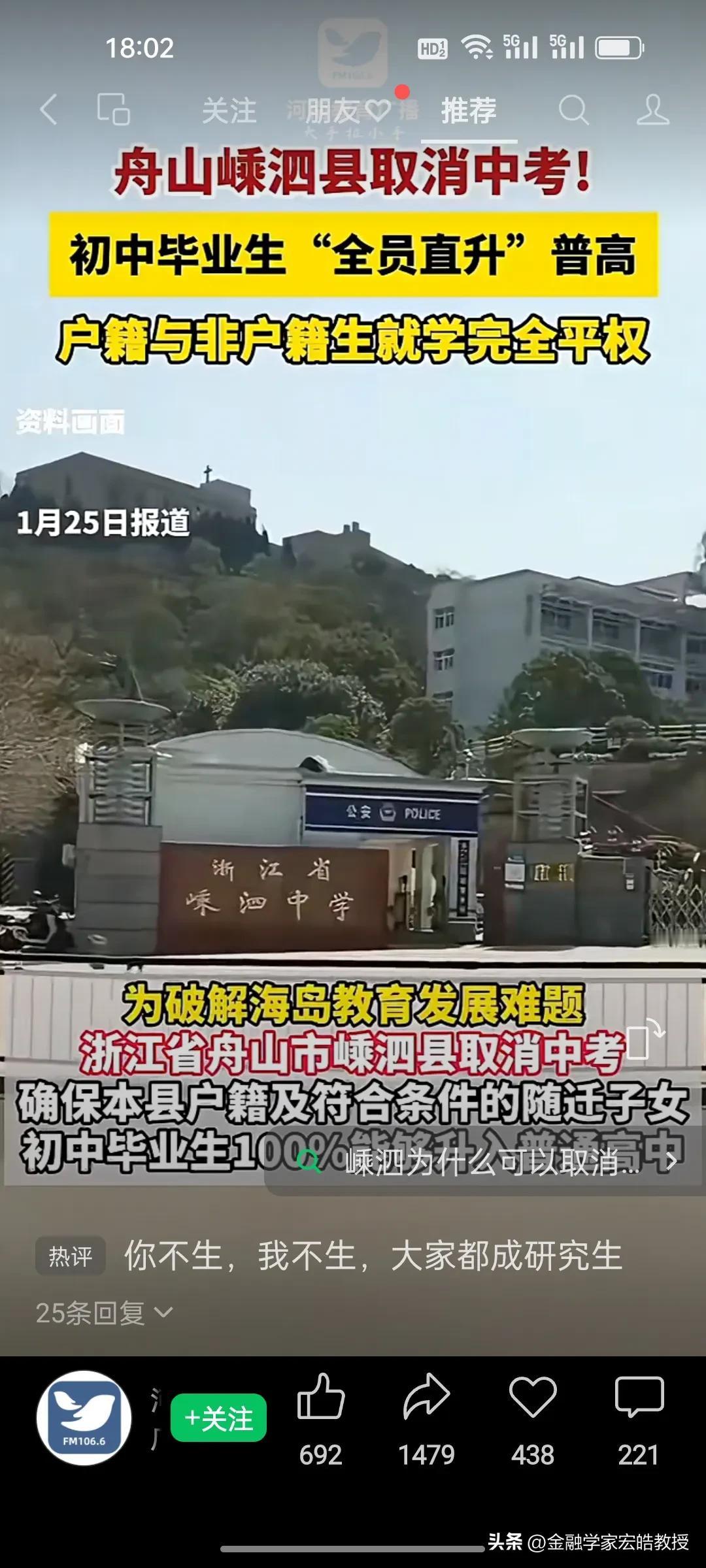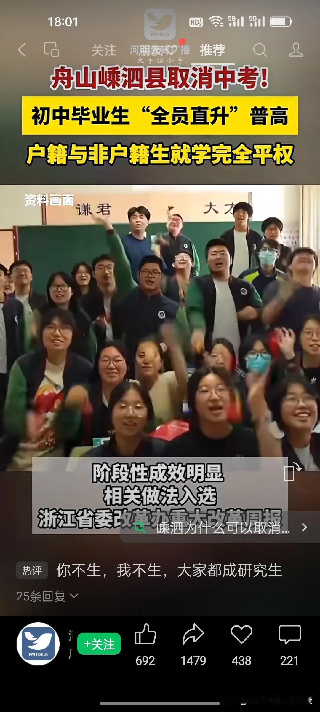 中考要成为历史了?浙江海岛县的尝试藏着未来教育大趋势。 舟山嵊泗县取消中考,初中毕业生全员直升普高,户籍与非户籍生同权,这一突破不仅是海岛教育的自救,更预示着普及高中的大幕正在拉开。 随着学龄人口持续减少,普高学位供需矛盾缓解,“全员升学”将从海岛走向更多地区。这不仅能让学生摆脱“一考定终身”的焦虑,更推动基础教育从“选拔竞争”转向“全面育人”,做到真正的“减负”,让每个孩子都能在更宽松的环境里成长。 其实北京也在用市级,区级,校级的1+3,0.5+3,集团校选拔等等这样的注重过程性学习的多次选拔方式来让一部分学生提前上岸,摆脱中考压力。 当嵊泗的探索成为样本,我们或许正在见证教育公平的下一个里程碑。