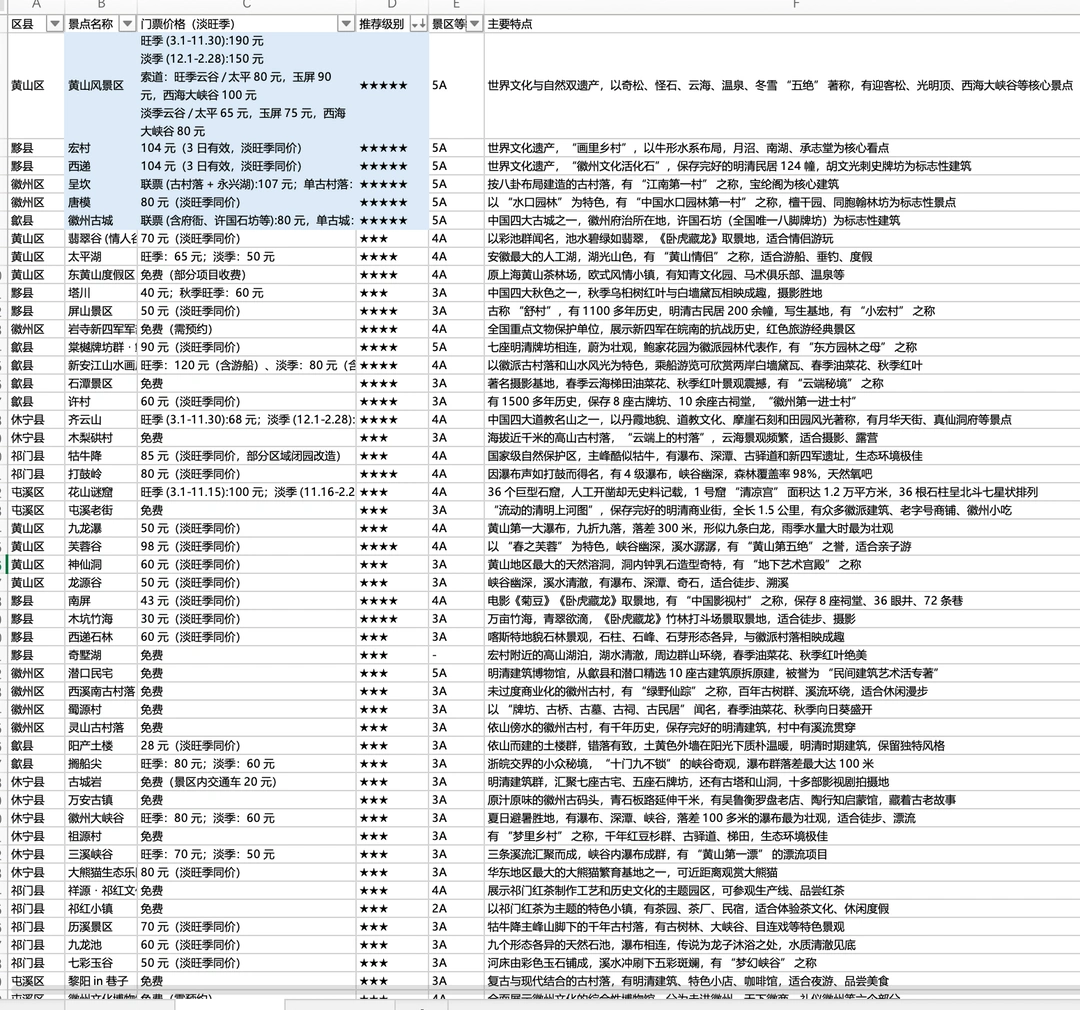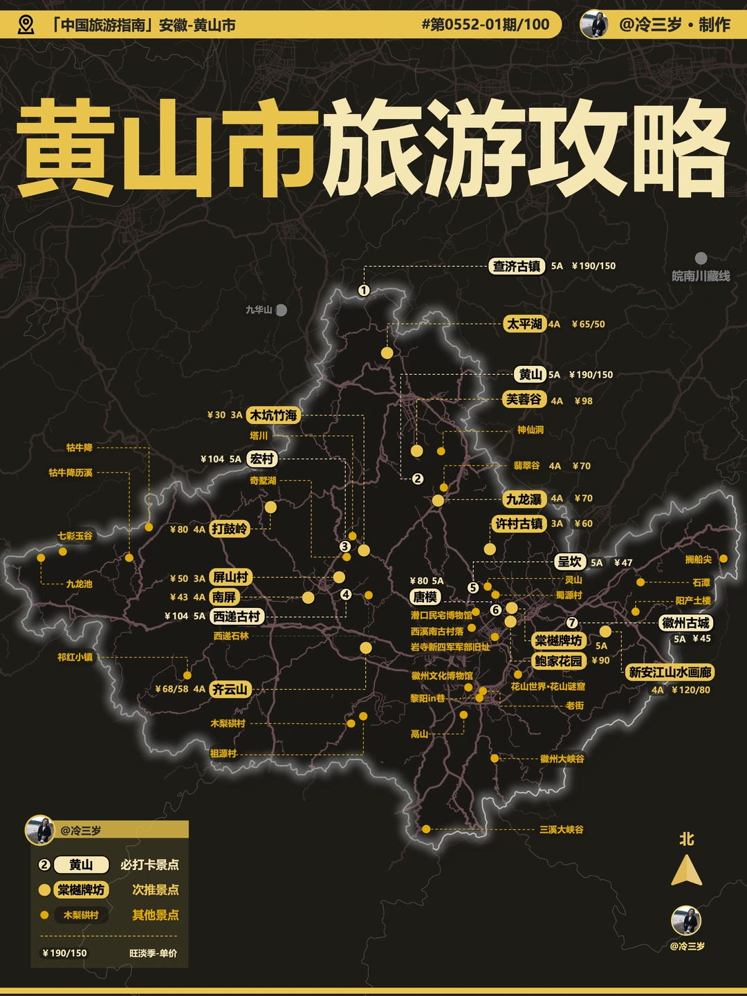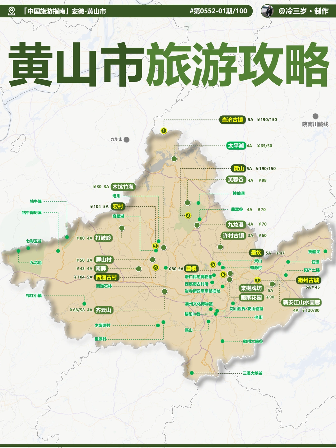 黄山市在中国各市游玩里面 应该能排到前20(前10不知道能不能冲) 我这次来南方 黄山市是首选 [拔草R]其中除了黄山 [拔草R]主要就是皖南古村落了,包括:宏村,西递(前者更为推荐) [拔草R]还有古徽州文化:徽州古城,棠樾牌坊群・鲍家花园,唐模,呈坎,潜口民宅 这几个是我打算必逛的 [拔草R]另外还有些山水:太平湖,牯牛降,新安江山水画廊,齐云山,这几个有时间就逛逛 [拔草R]鱼灯是这里的特色,主要在歙县(汪满田、瞻淇等) 不过有1说1 [笑哭R]黄山市的各个景点门票不便宜 连这里的年卡还要400 像水韵江苏、诗画浙江等年卡才不到200 [笑哭R]还有,黄山上想看日出,住宿还挺贵的,淡季工作日还得1000多 不过难得的景色 还是值得的 [合十R]希望能看到冬雪雾凇 待我这次逛完,深度体验之后 分享出来更为详细的攻略吧 PS.我应该由北往南依次逛,这几天先逛苏州,晚几天出发 D1:查济古镇 D2~3:黄山 D4~5:宏村 D6:西递 D7:唐模 D8:呈坎 D9:徽州古城 此外还留了几天buffer 其他地方,穿插加吧 [耶R][耶R][耶R]PS.做个小咨询 图1~3,哪个图相对好点呀?(2-3还没做完)
